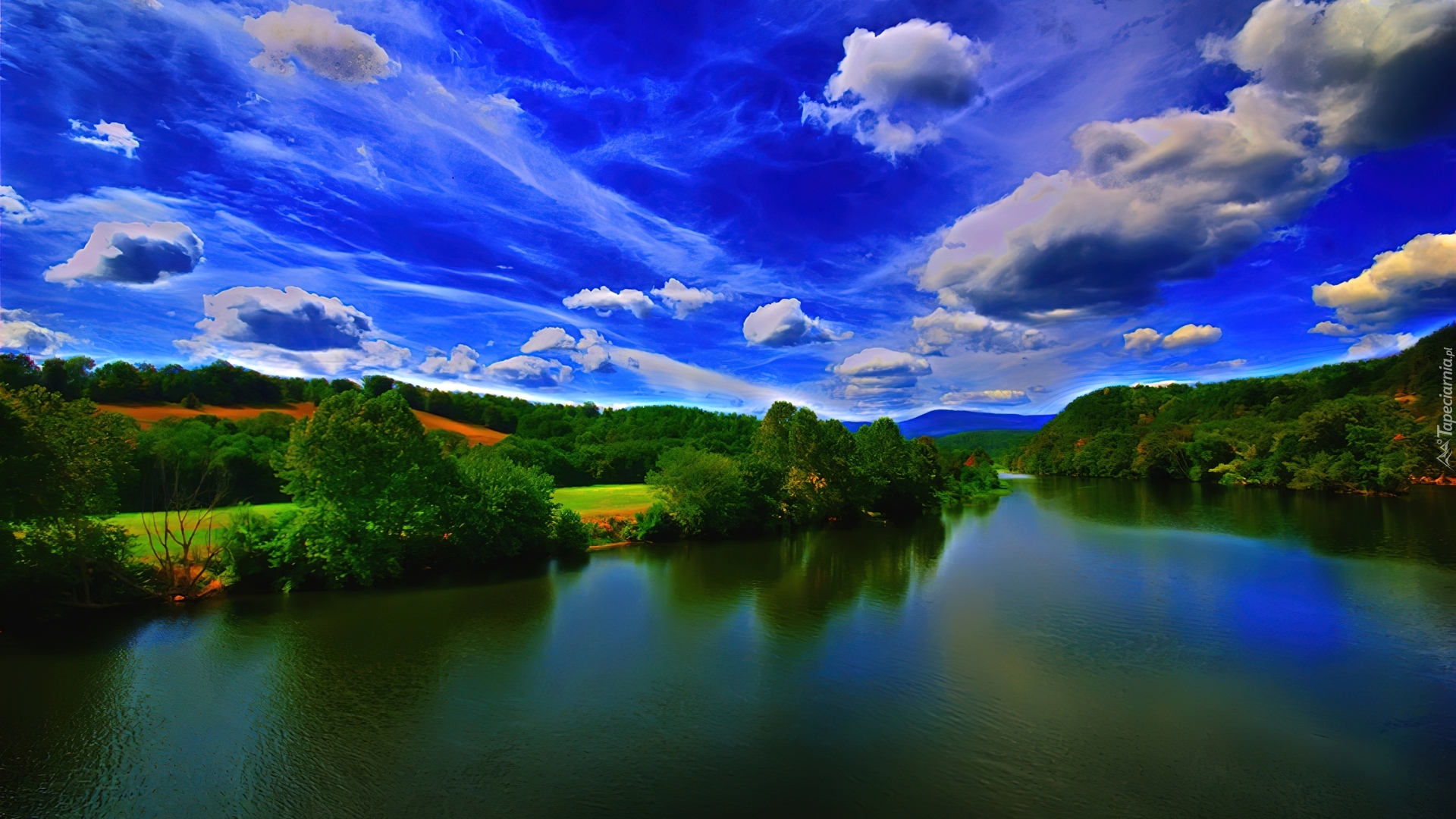 Edytor tapety: Rzeka, Pagórki, Drzewa, Chmury