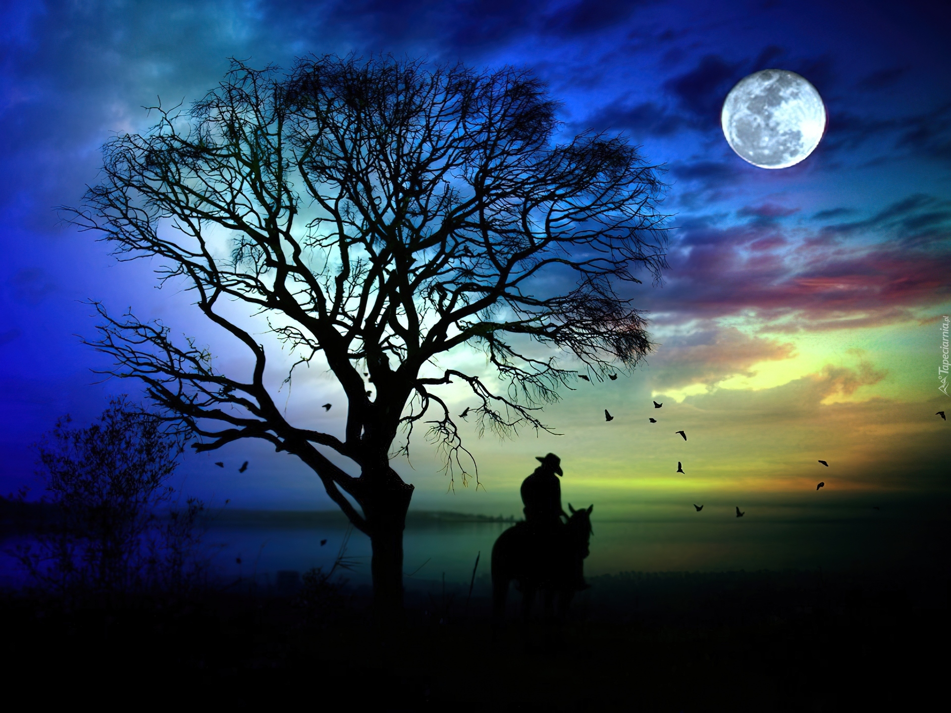 Edytor tapety: Jeździec, Księżyc, Drzewo