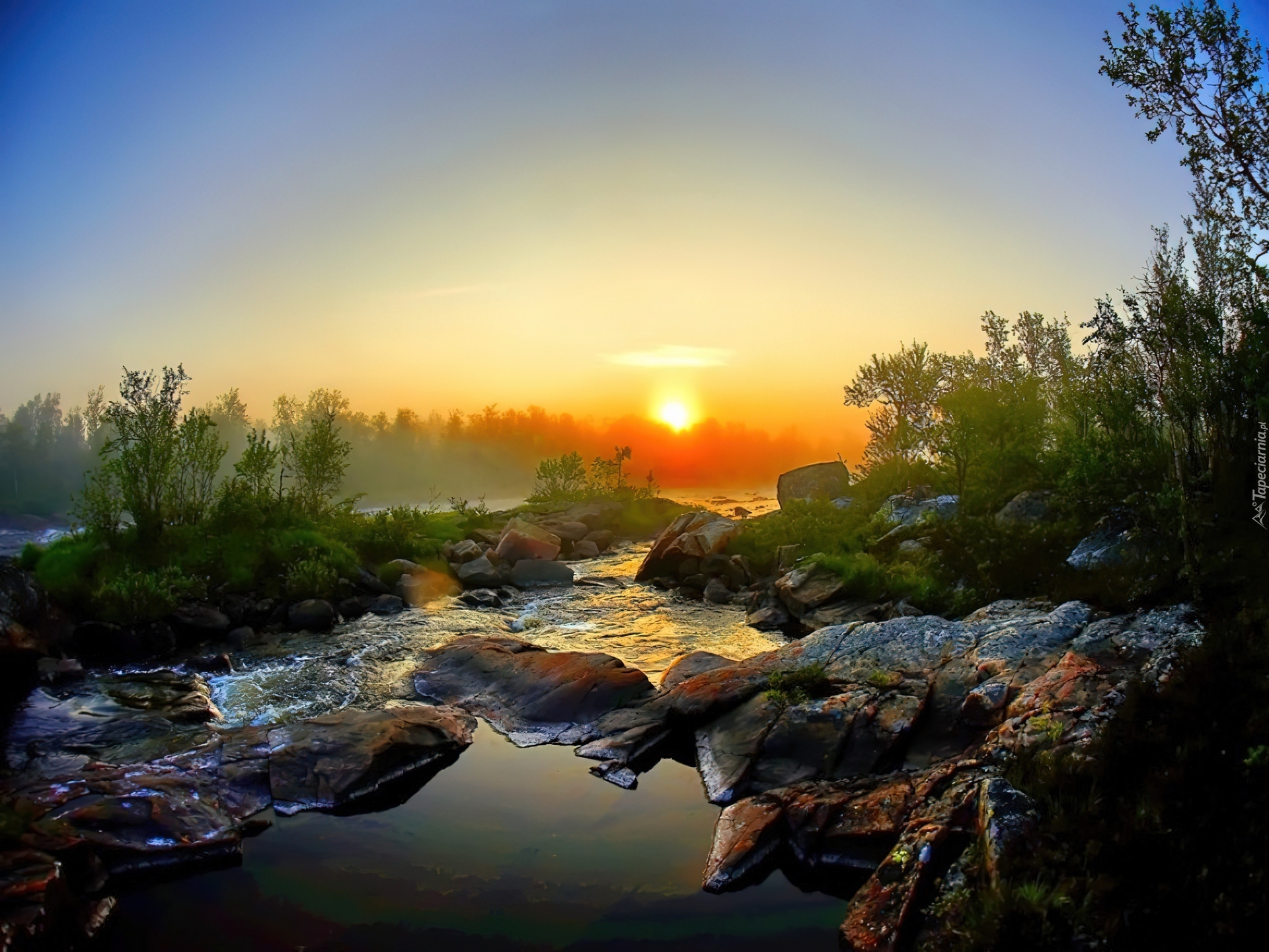 Edytor tapety: Zachód, Słońca, Rzeka, Kamienie