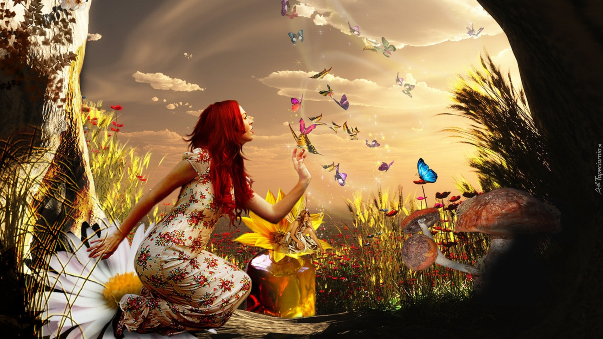 Edytor tapety: Dziewczyna, Kwiaty, Motyle