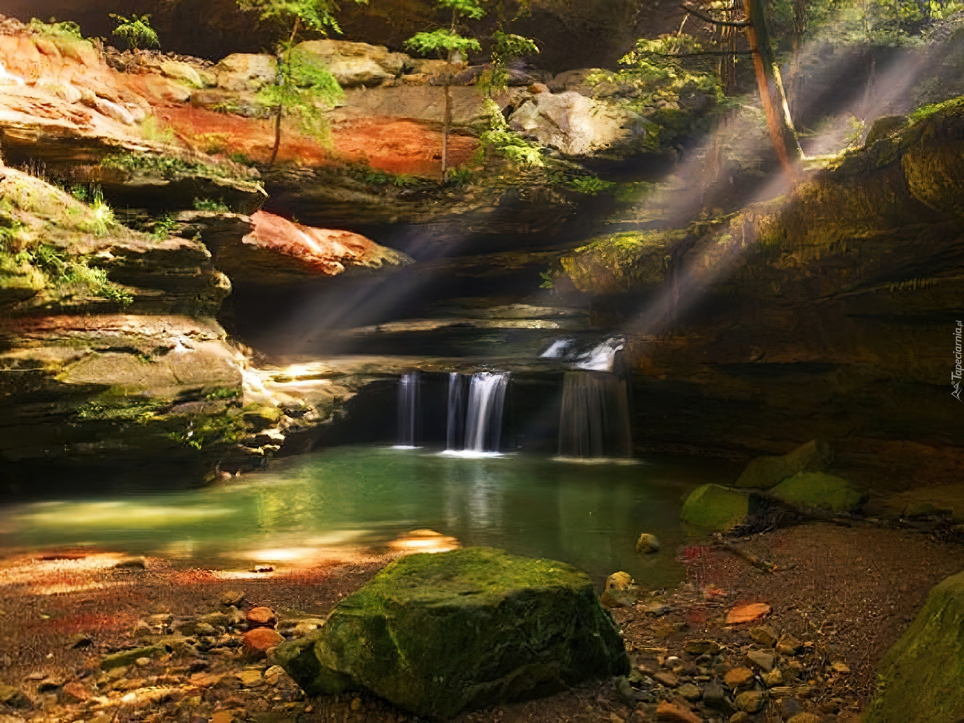 Edytor tapety: Wodospad, Skały, Promienie