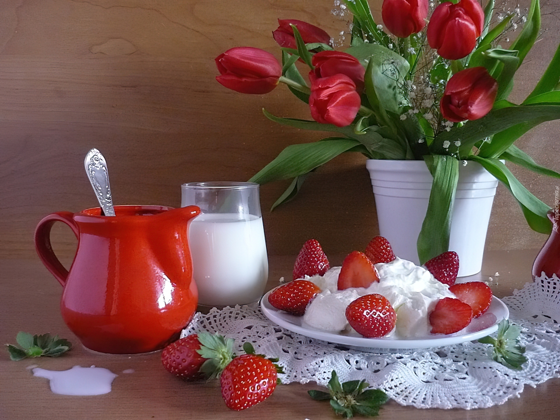 Edytor tapety: Kwiaty, Czerwone, Tulipany, Truskawki, Dzbanek