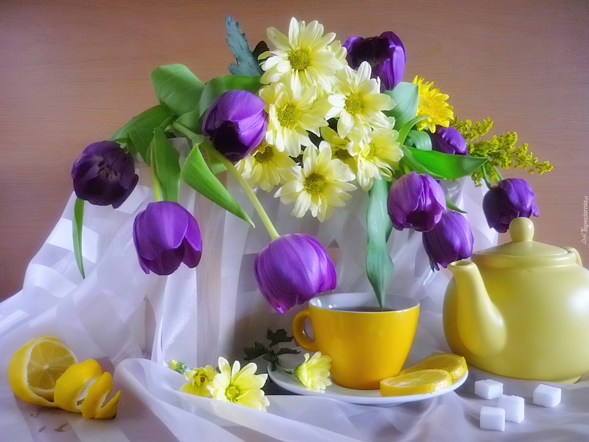 Edytor tapety: Kwiaty, Fioletowe, Tulipany, Dzbanek