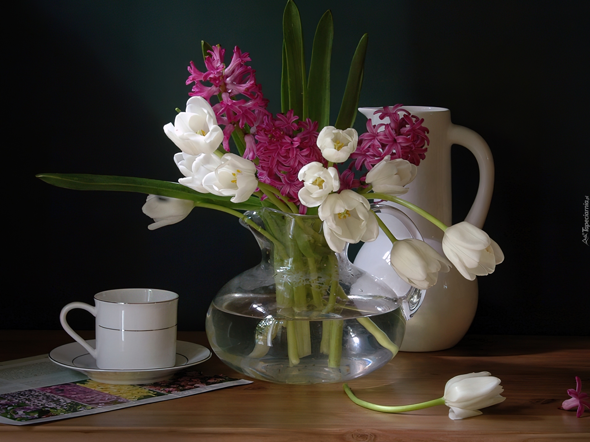 Edytor tapety: Kwiaty, Białe, Tulipany, Dzbanek, Filiżanka