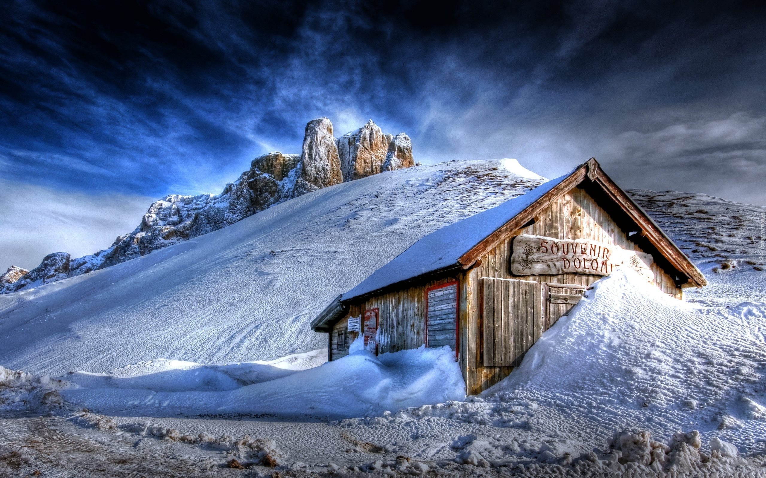 Edytor tapety: Zima, Góry, Chata, Śnieg