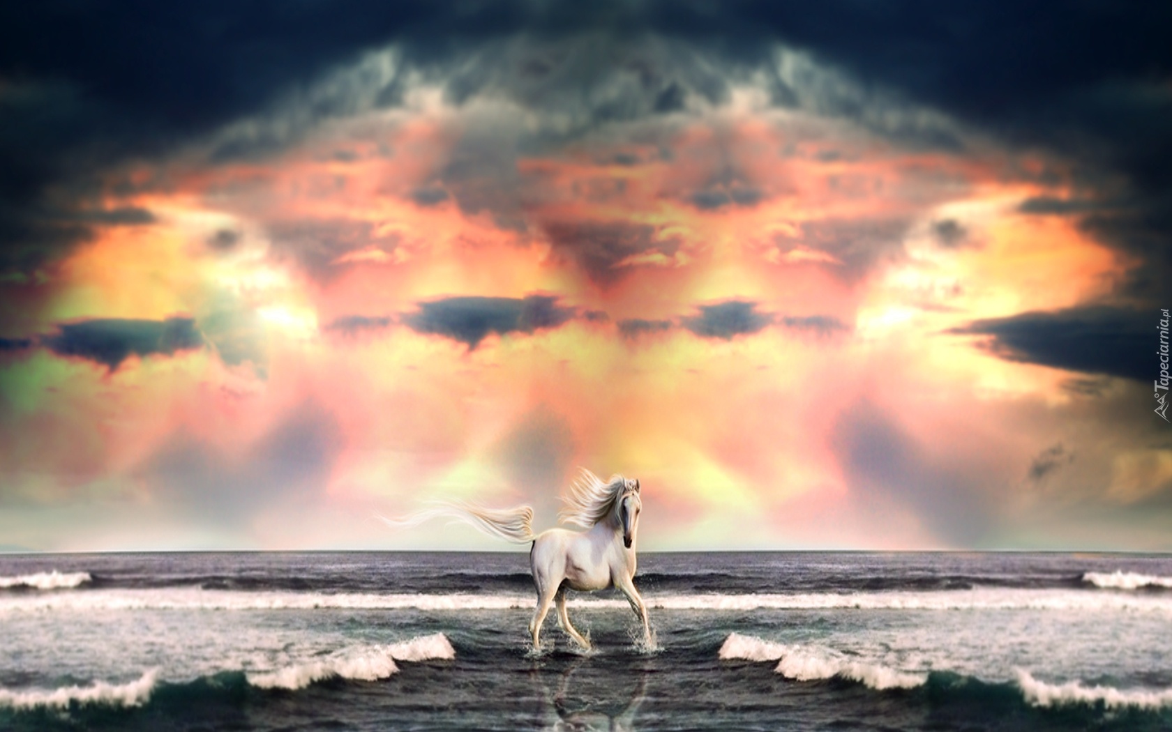Edytor tapety: Morze, Plaża, Koń, Kolorowe, Niebo