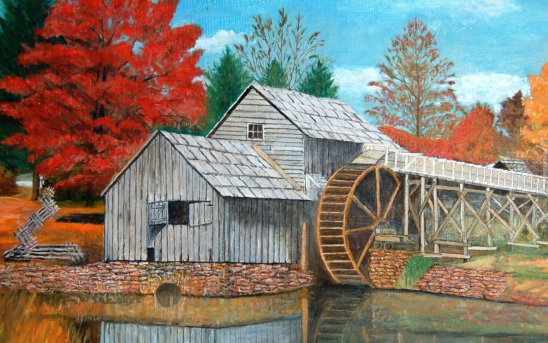 Edytor tapety: Jesień, Drzewa, Młyn, Woda
