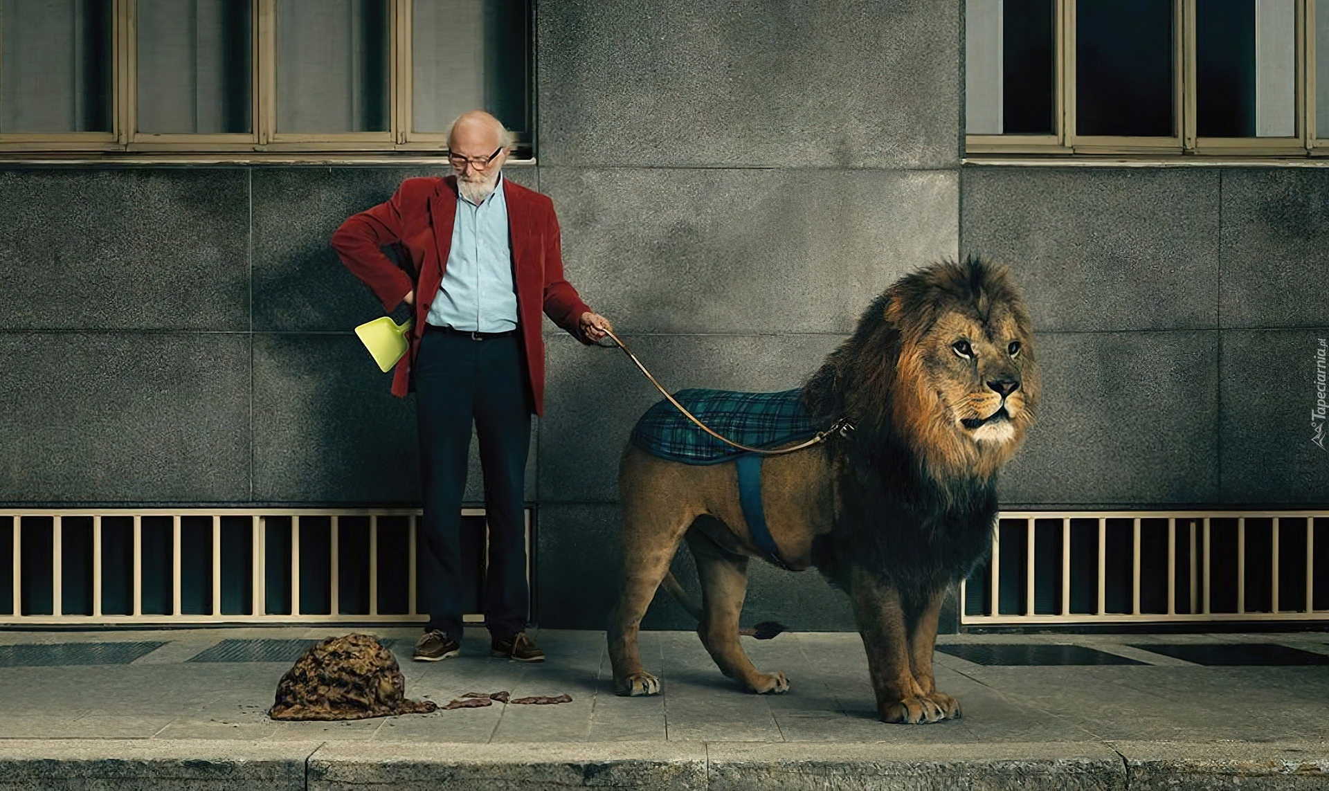 Edytor tapety: Lew, Na, Smyczy, Człowiek, Chodnik