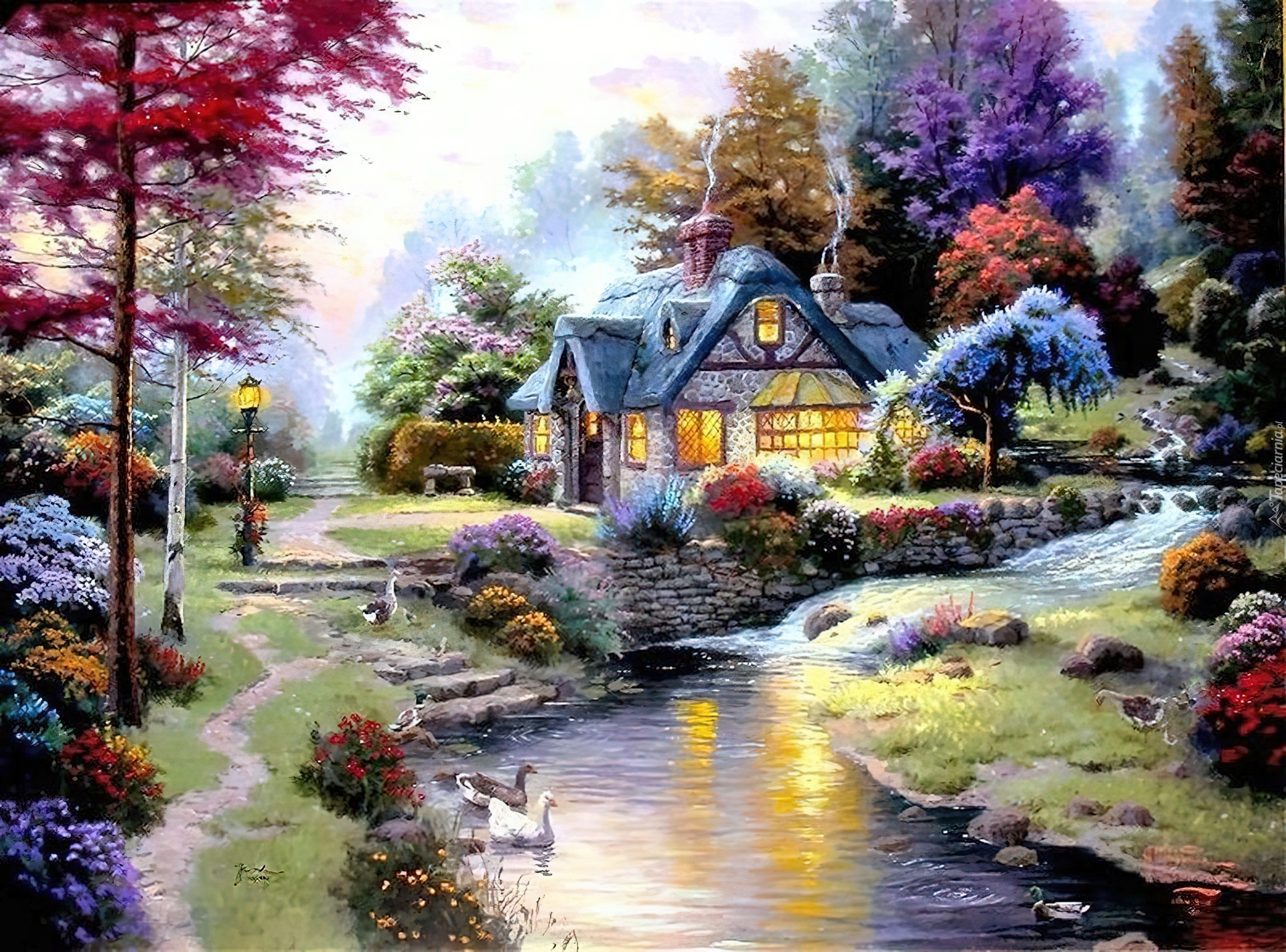 Edytor tapety: Domek, Rzeczka, Ogród