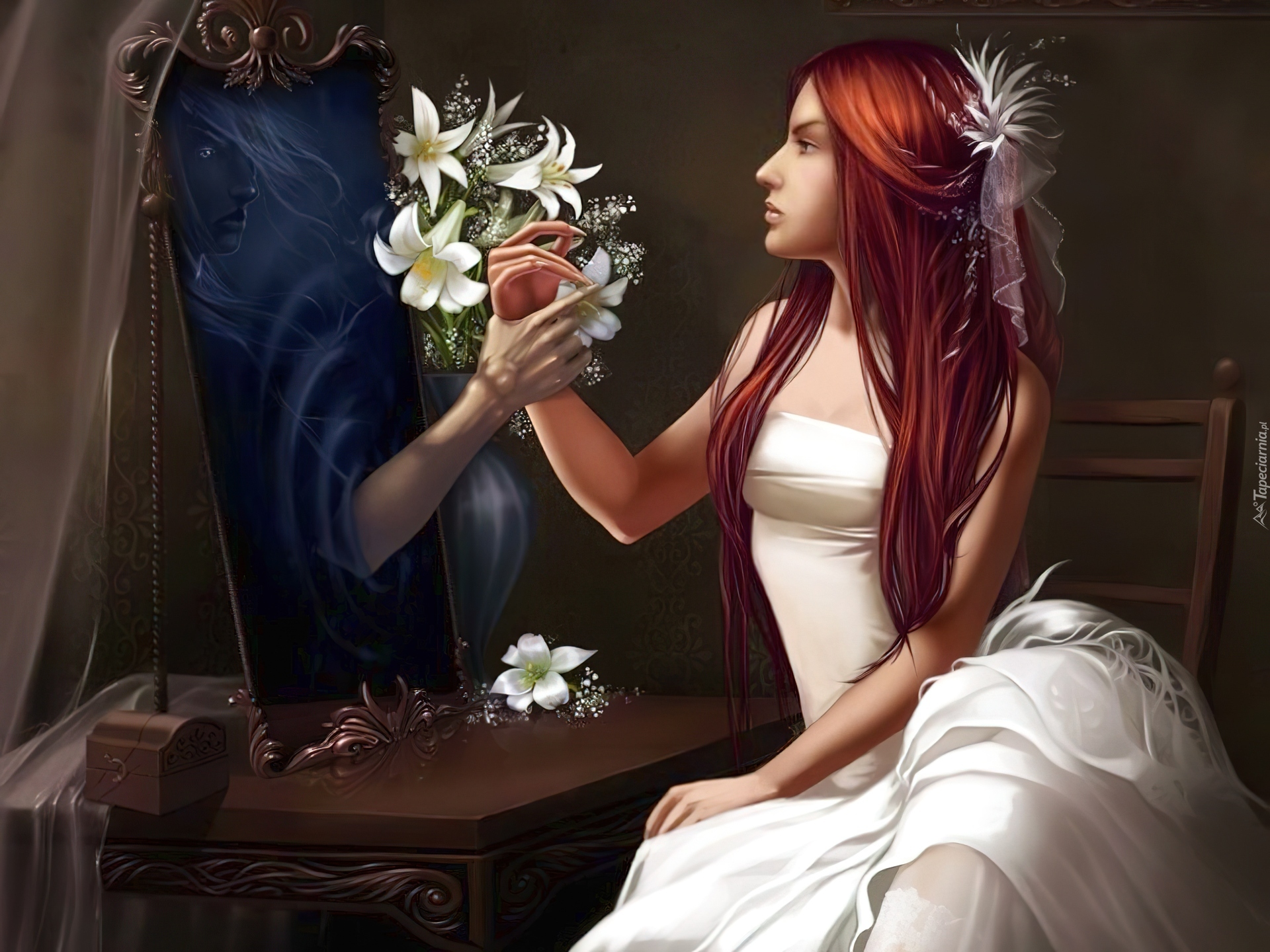 Edytor tapety: Kobieta, Dłonie, Lustro, Kwiaty