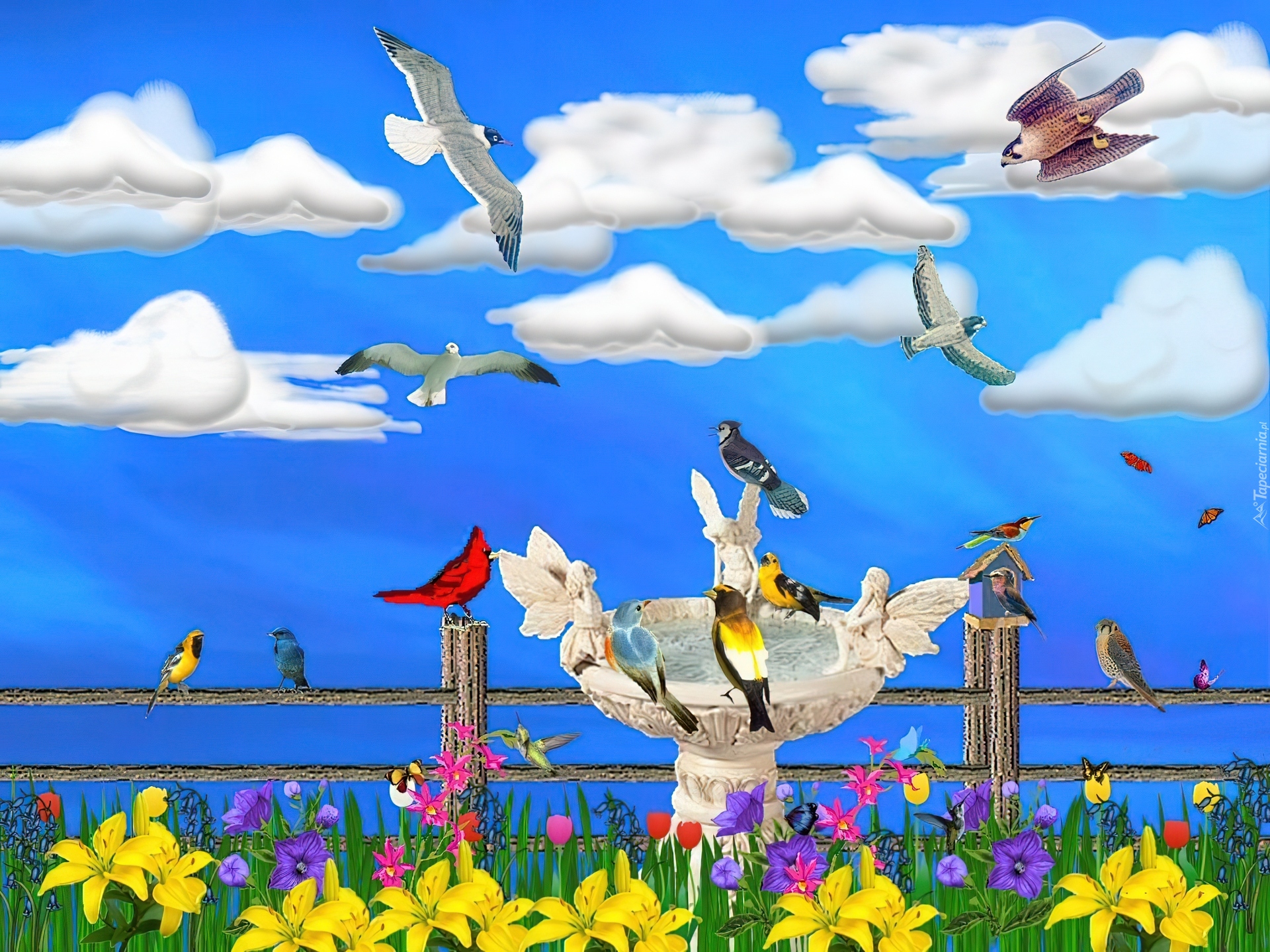 Edytor tapety: Ogródek, Kwiaty, Różne, Ptaki