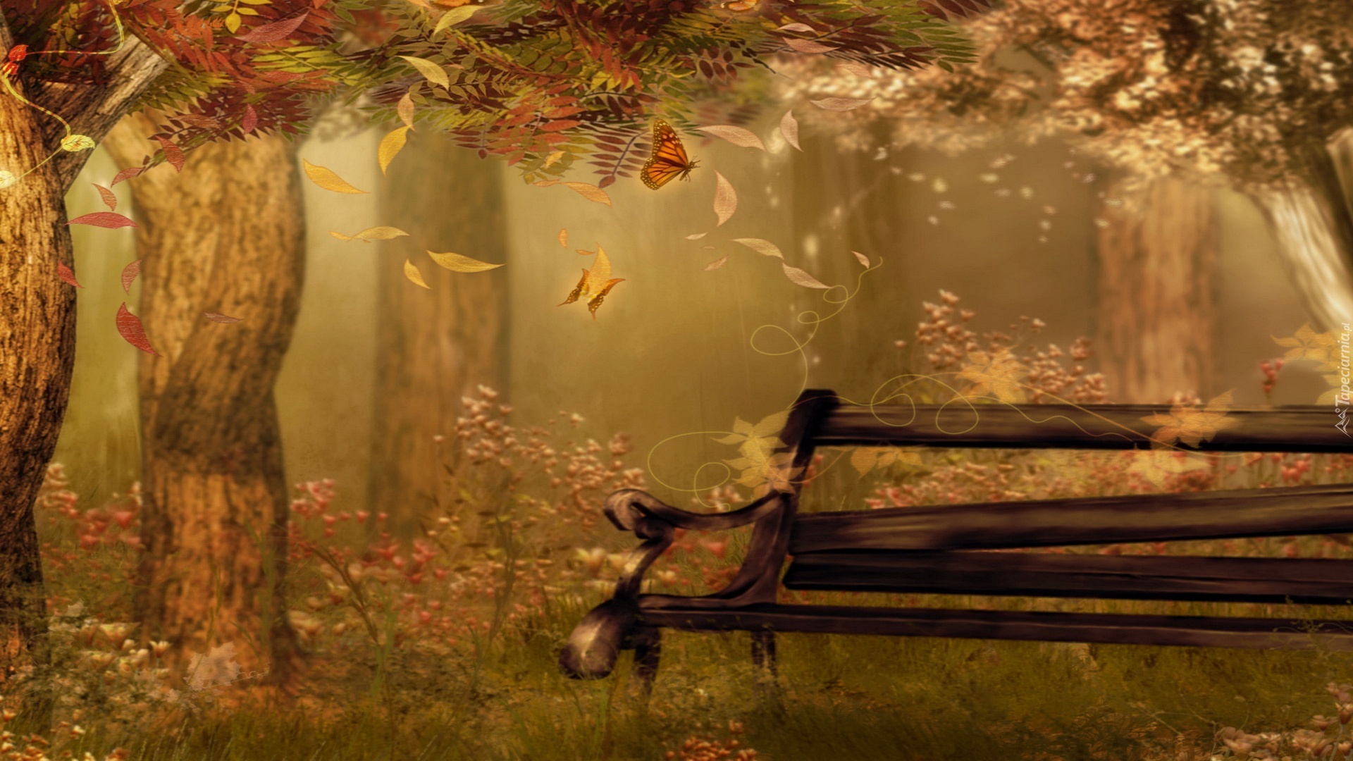 Edytor tapety: Ławka, Drzewa, Motyl, Art, Fantasy