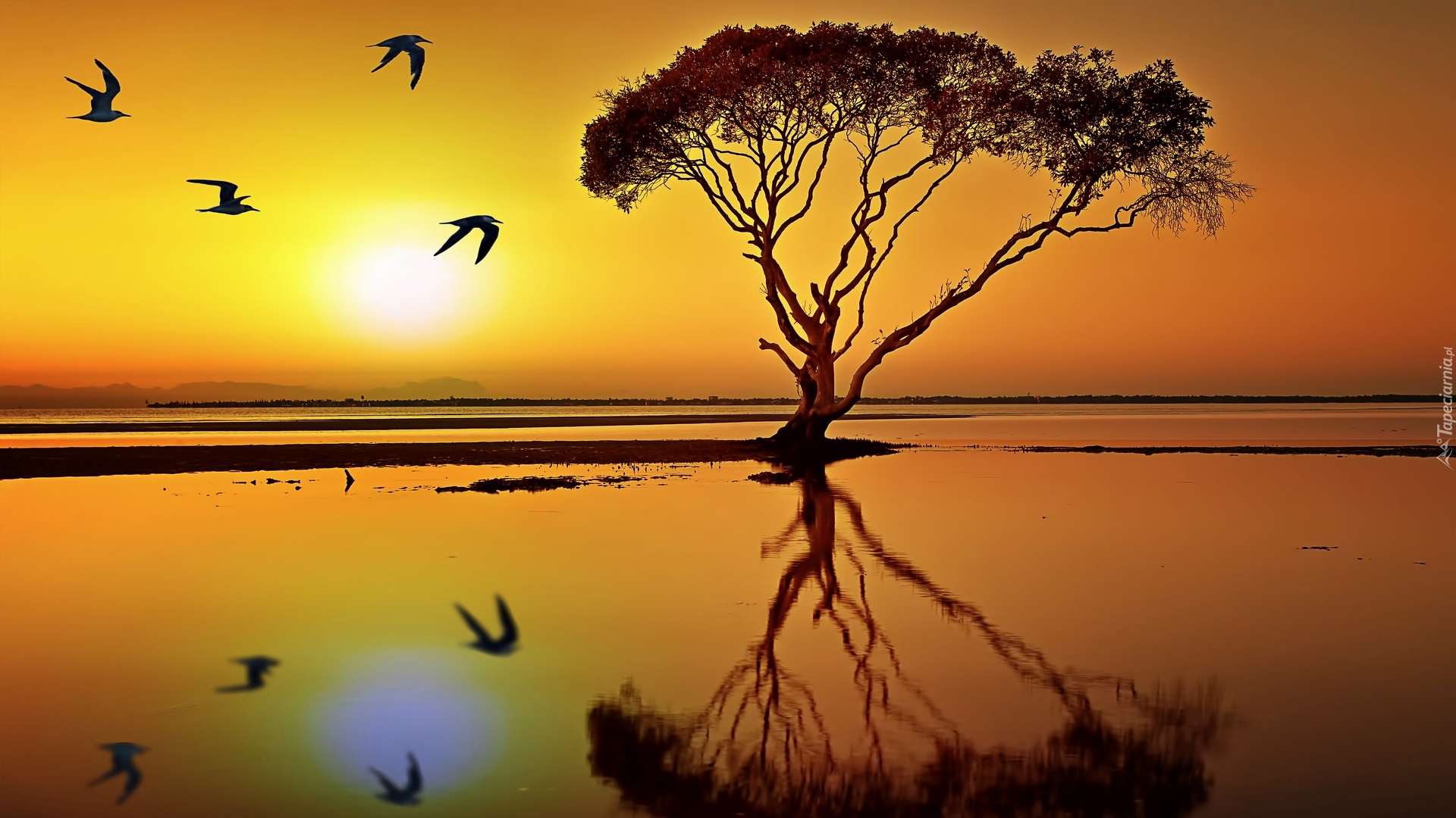 Edytor tapety: Zachód, Słońca, Jezioro, Drzewo