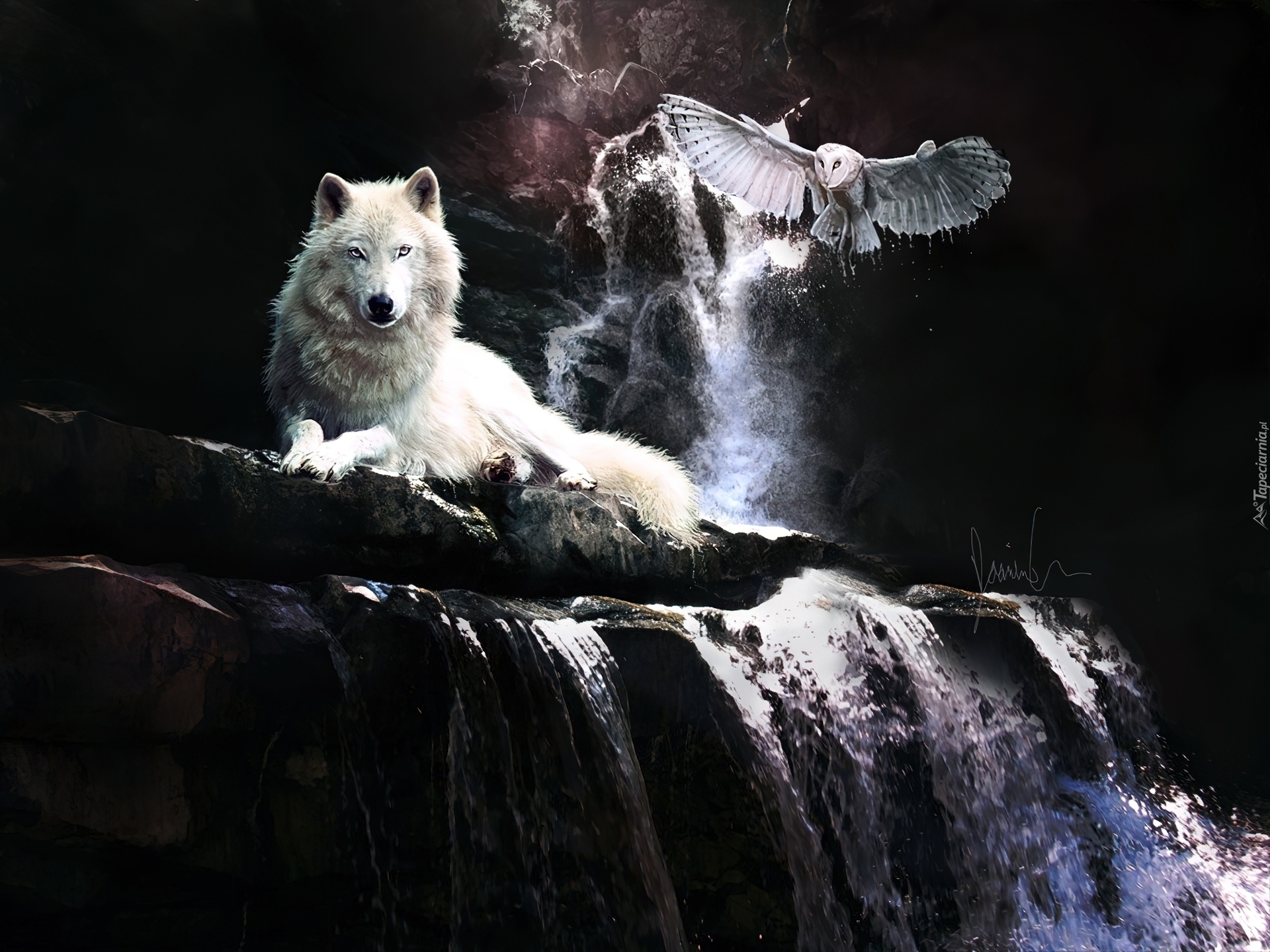 Edytor tapety: Wilk, Sowa, Wodospad