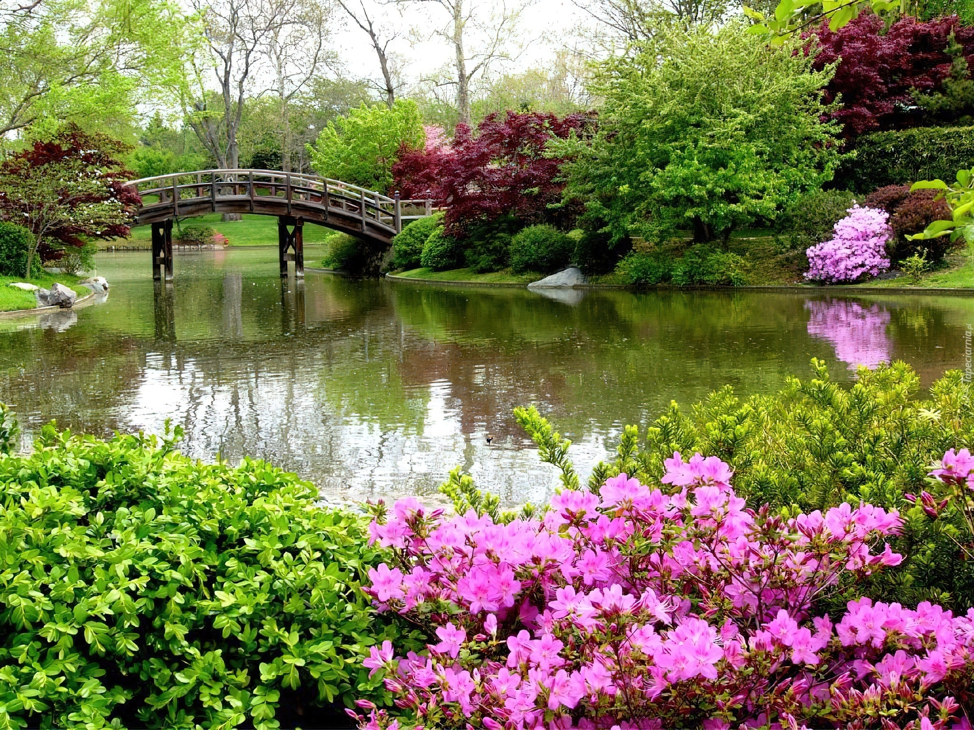 Edytor tapety: Ogród, Mostek, Woda, Kwiaty