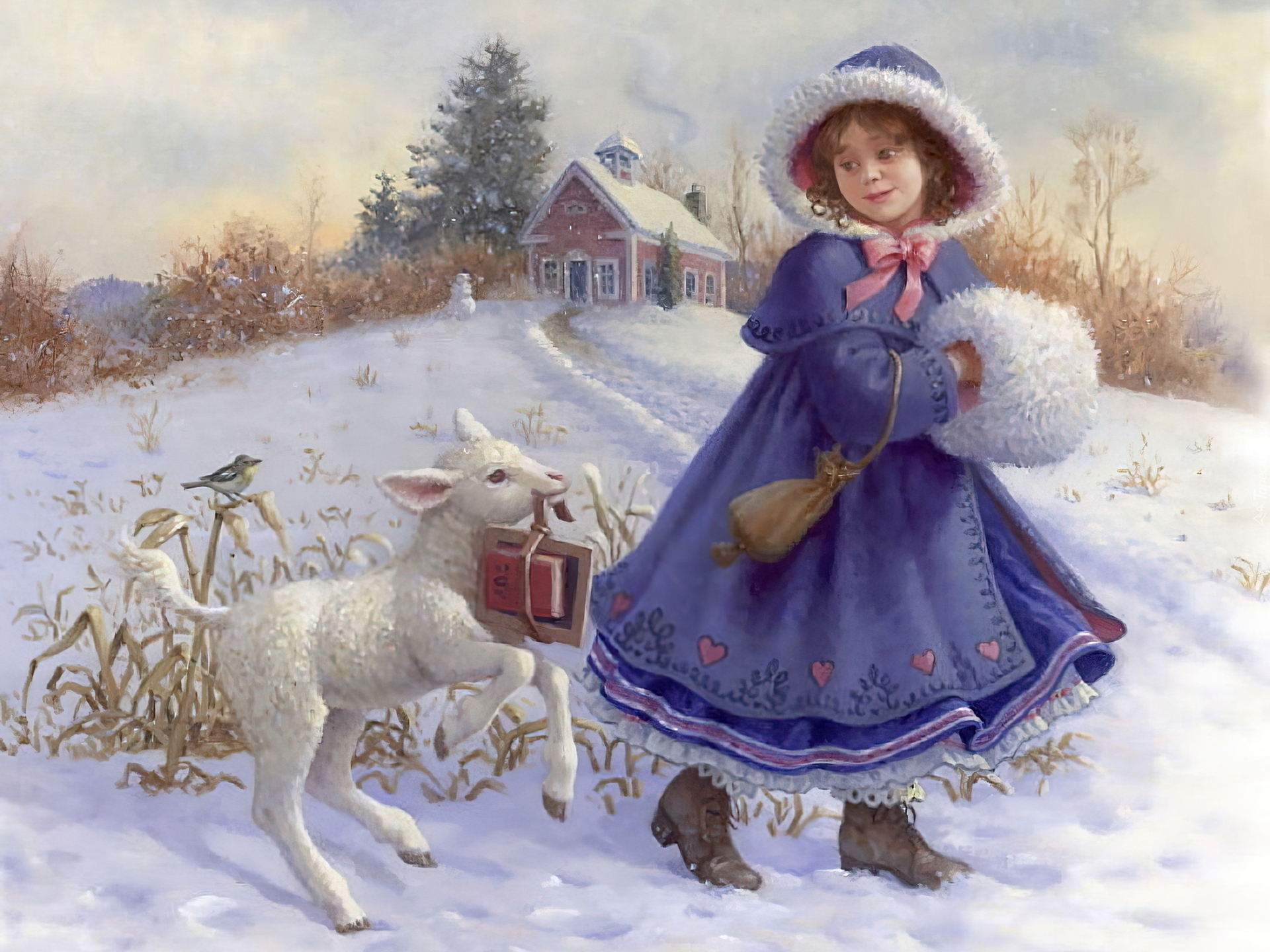 Edytor tapety: Dziewczynka, Owieczka, Dom, Śnieg
