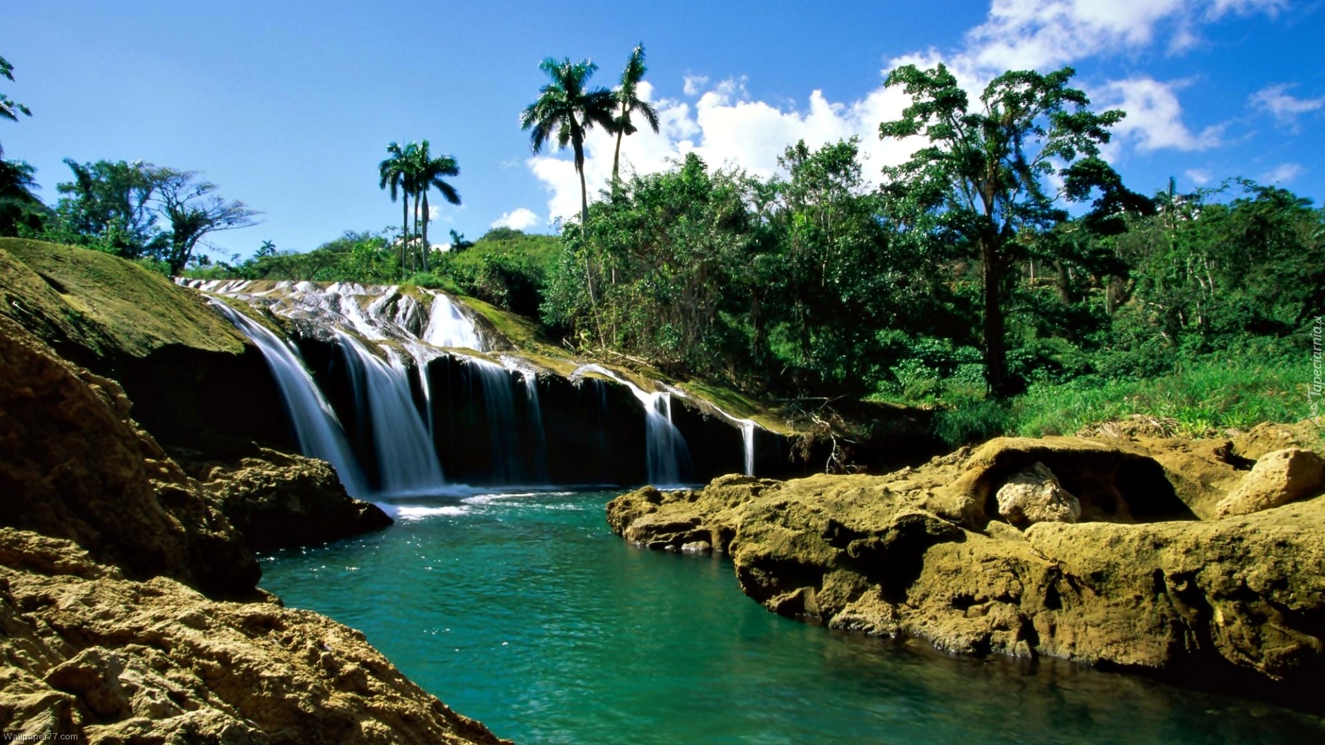 Edytor tapety: Wodospad, Drzewa, Skały, Rzeka