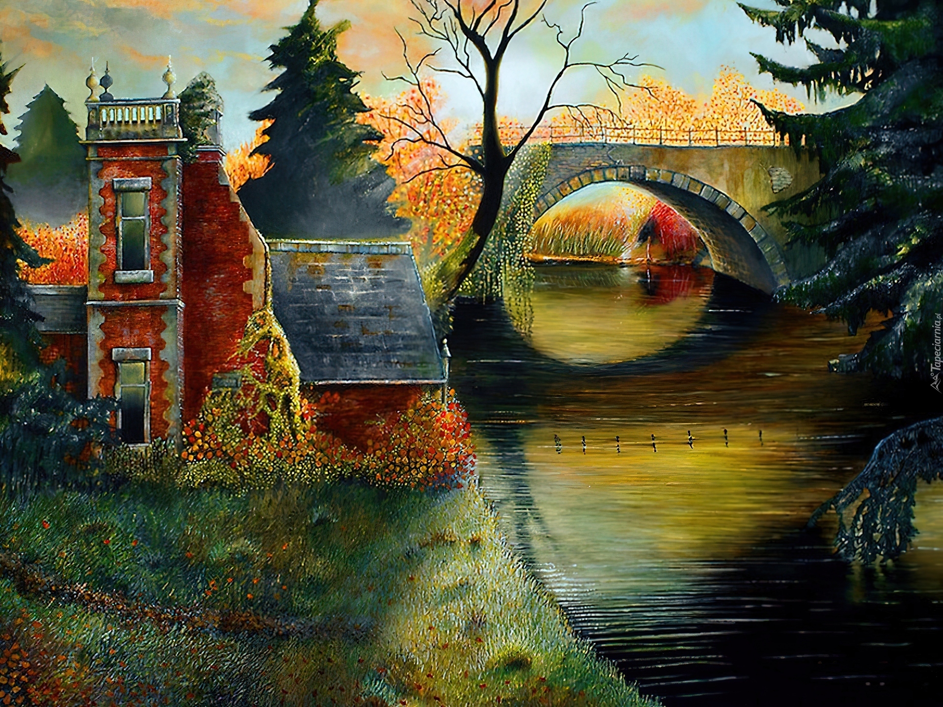 Edytor tapety: Jesień, Most, Dom, Rzeka