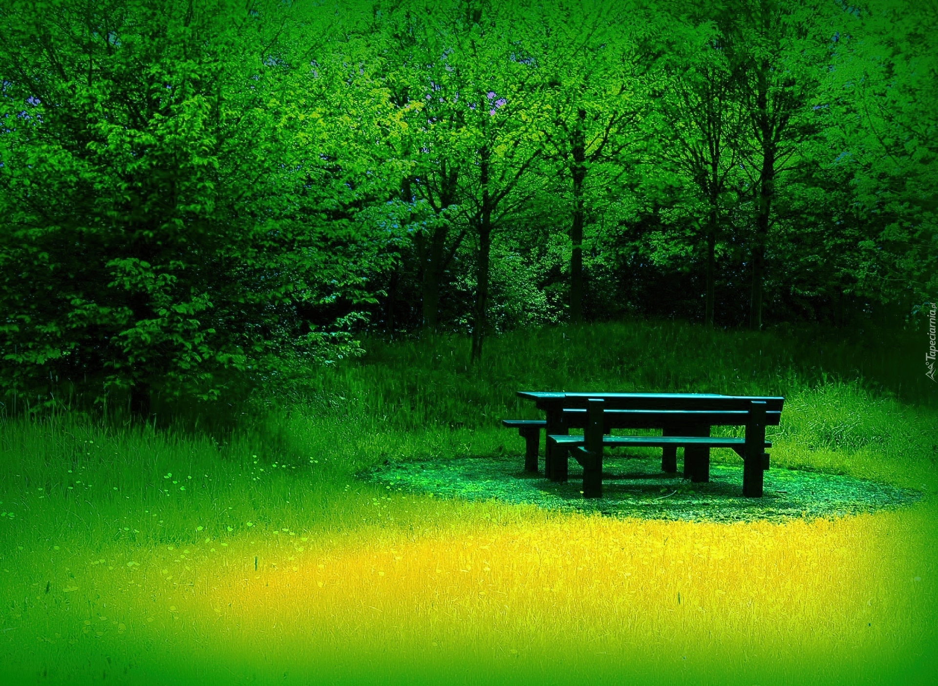 Edytor tapety: Lato, Trawa, Drzewa, Ławka