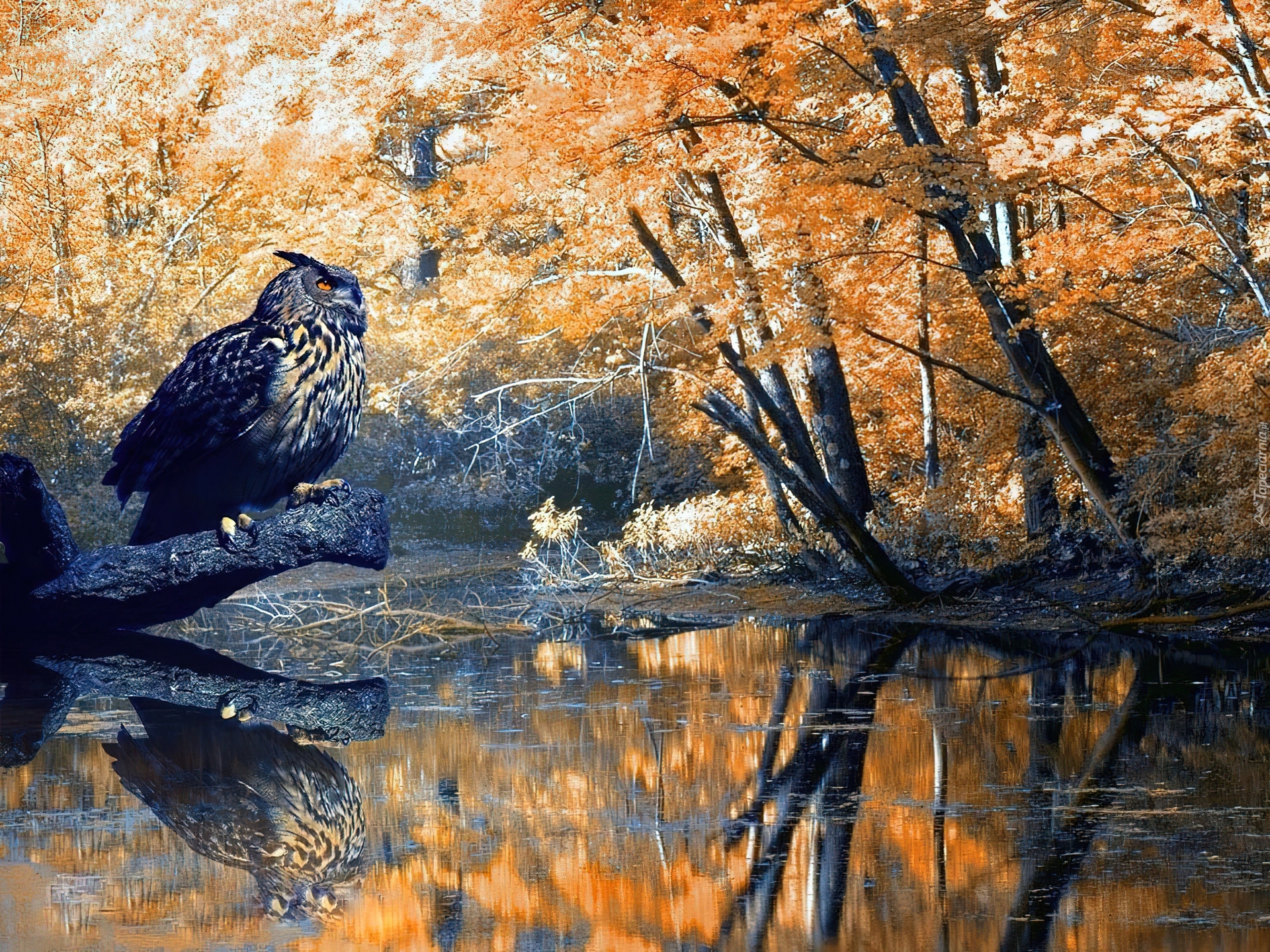Edytor tapety: Sowa, Jesień, Woda, Drzewa