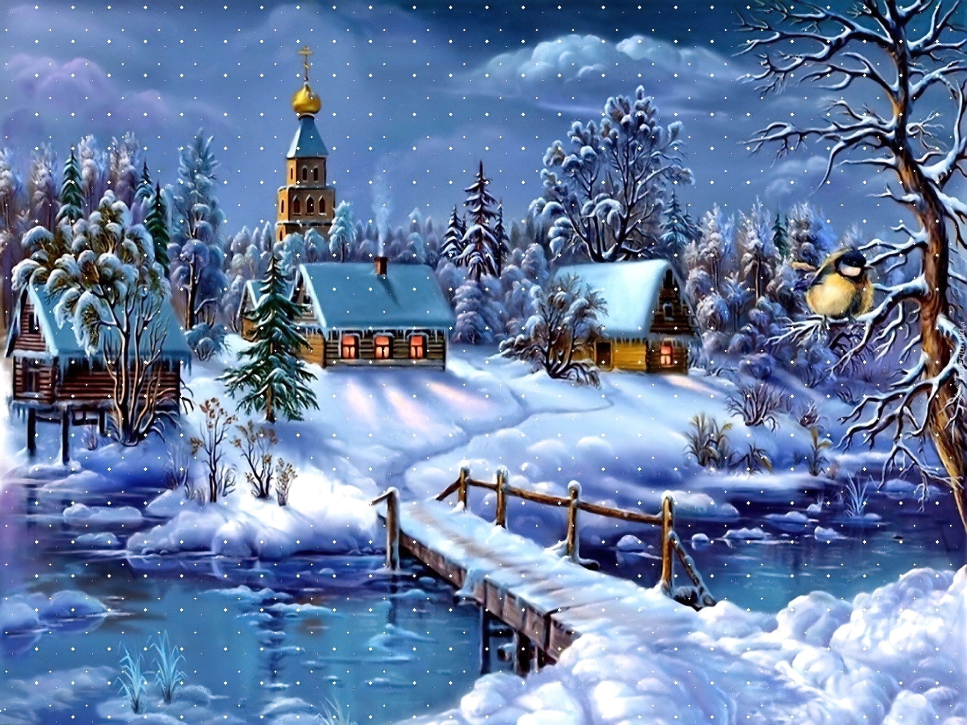 Edytor tapety: Zima, Kościół, Dom, Mostek, Rzeka