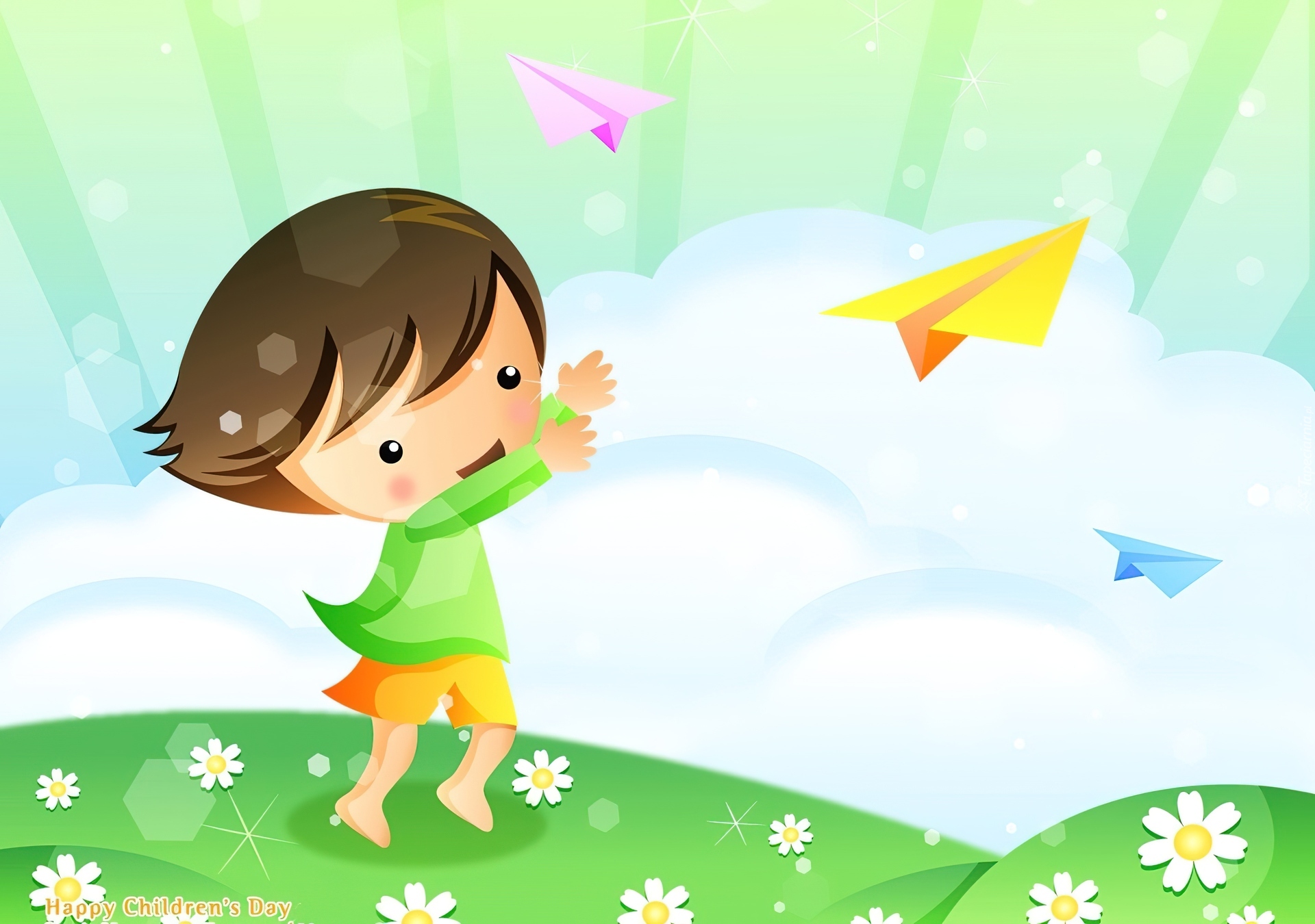 Edytor tapety: Dziecko, Łąka, Papierowe, Samoloty, Radość
