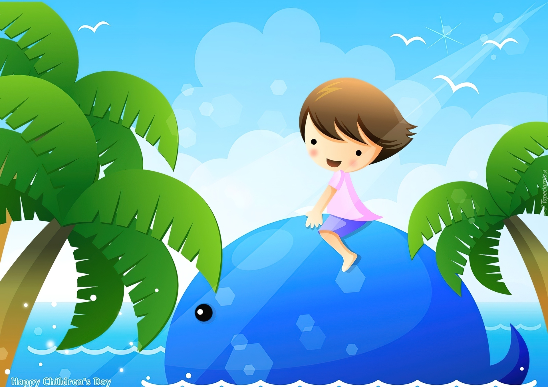 Edytor tapety: Dziecko, Morze, Palmy, Wieloryb