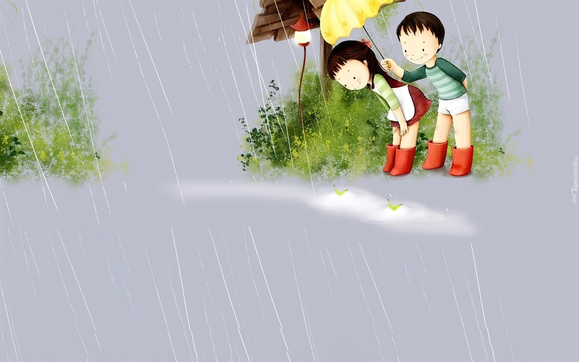 Edytor tapety: Dwoje, Dzieci, Deszcz, Parasole, Kałuże