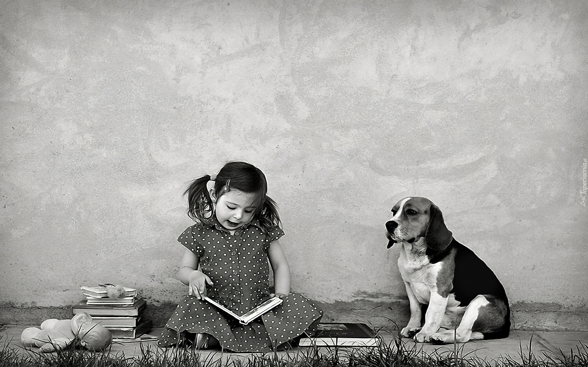 Edytor tapety: Dziewczynka, Książki, Pies, Beagle