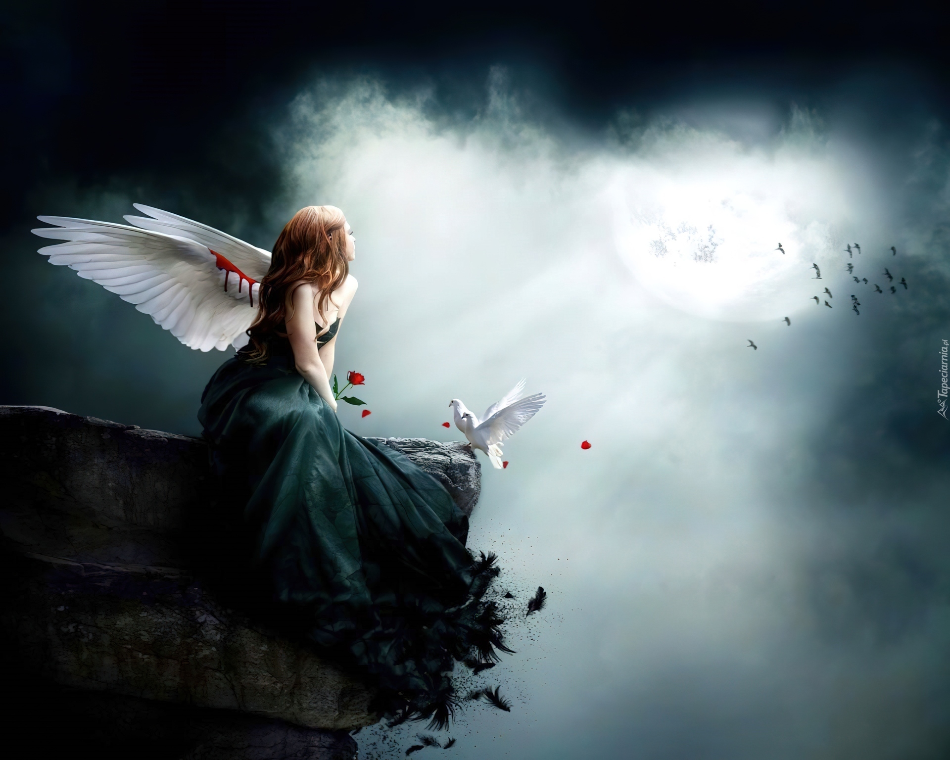 Edytor tapety: Kobieta, Skrzydła, Księżyc, Gołębie