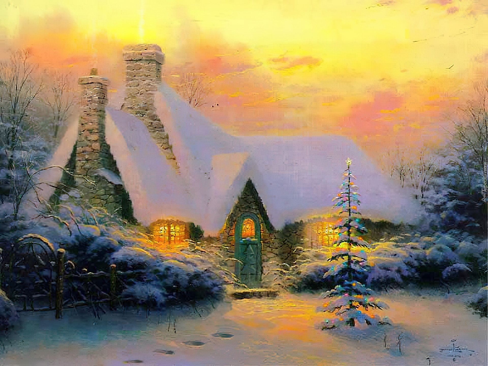 Edytor tapety: Dom, Śnieg, Choinka, Noc, Światło