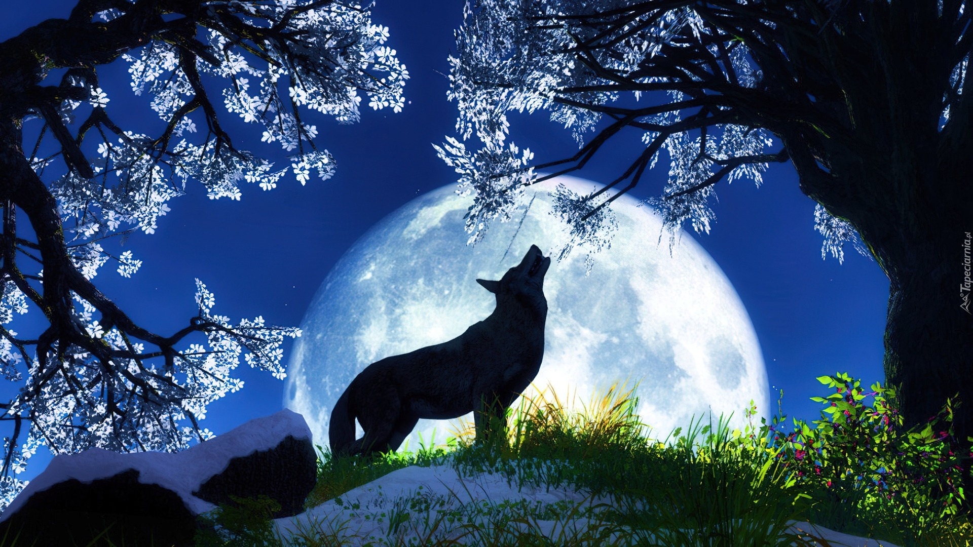 Edytor tapety: Wyjący, Wilk, Drzewa, Noc