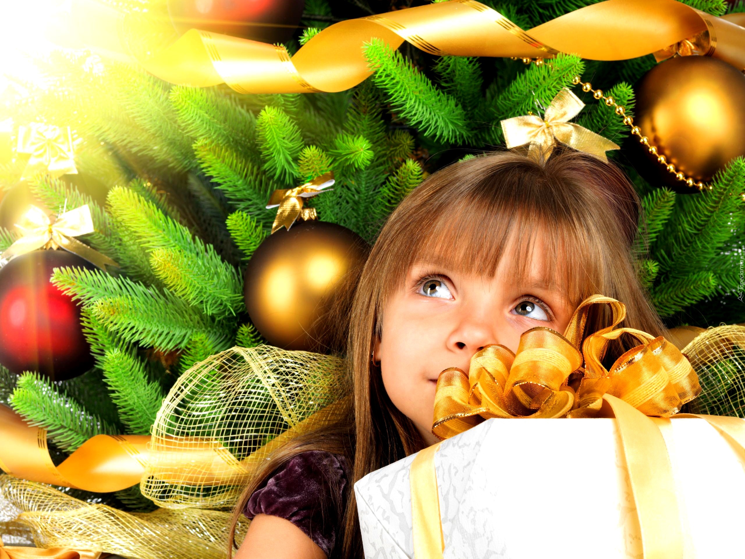 Edytor tapety: Dziewczynka, Prezent, Choinka