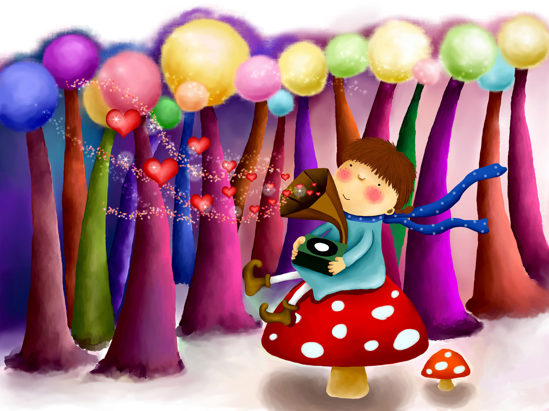 Edytor tapety: Dziecko, Park, Drzewa, Grzyb, Gramofon, Muzyka