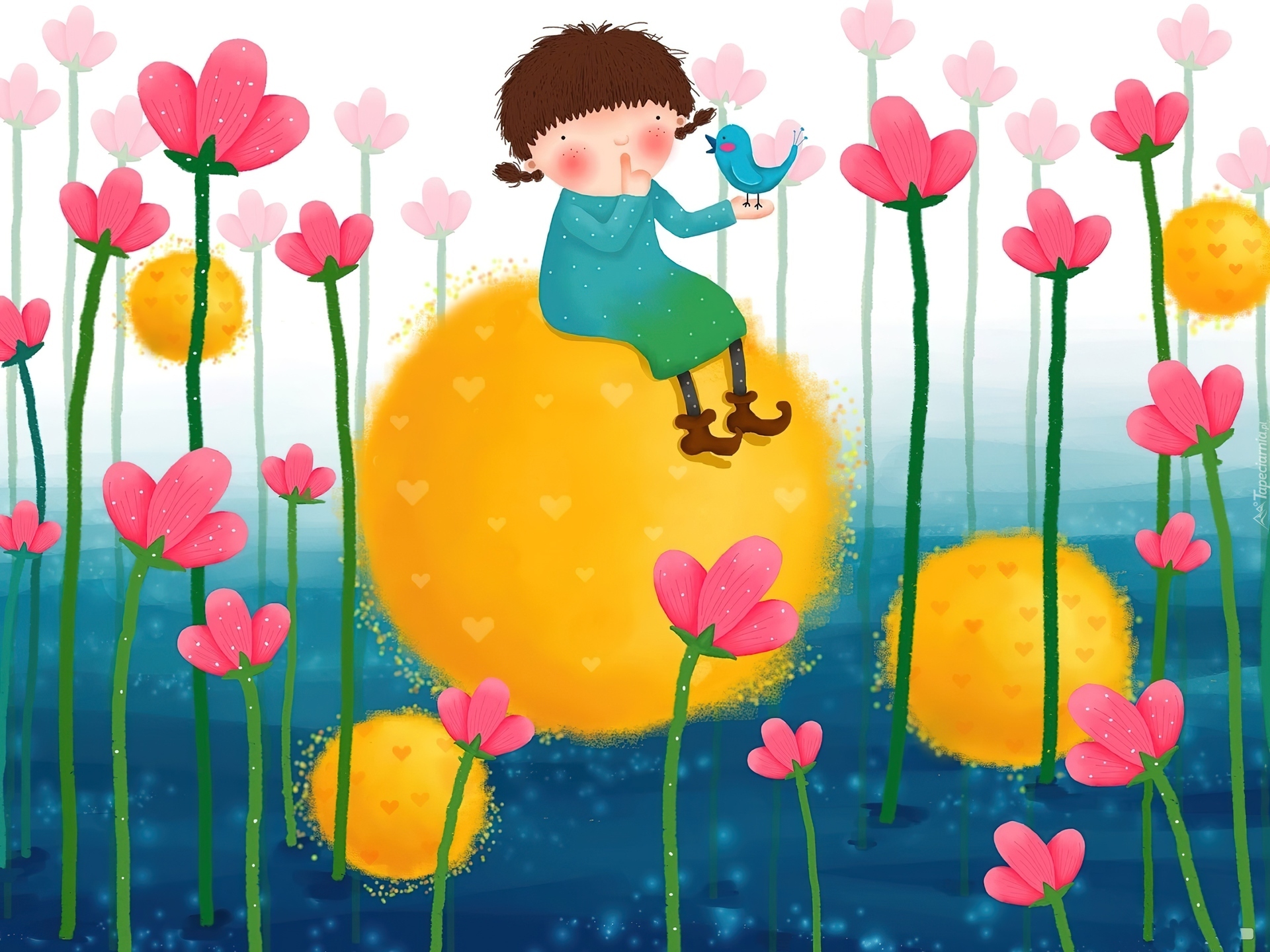 Edytor tapety: Dziecko, Łąka, Kwiaty, Ptaszek