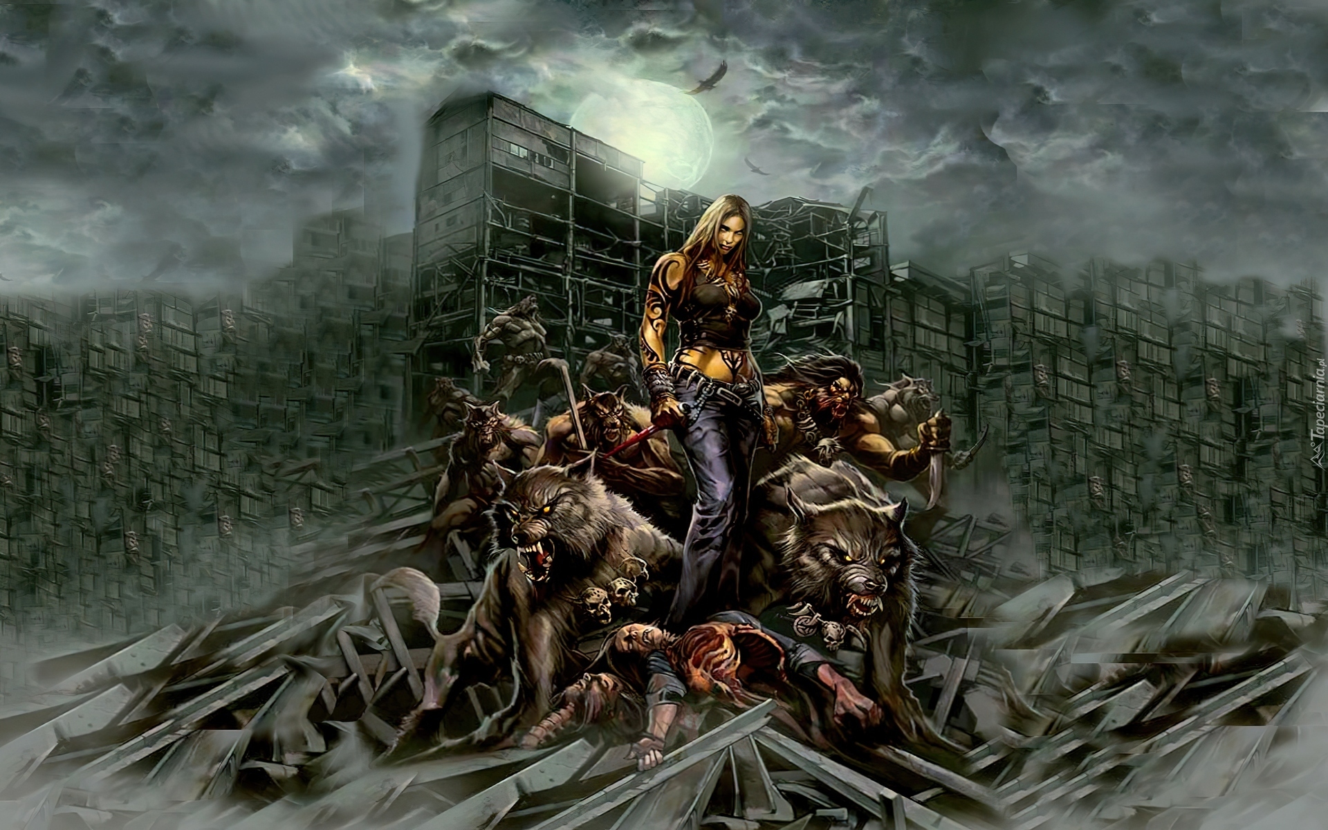 Edytor tapety: Kobieta, Wilki, Księżyc