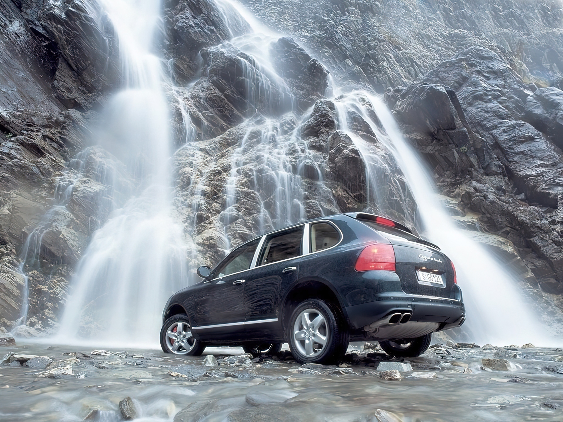 Edytor tapety: Porsche, Cayenne, Turbo, Wodospad