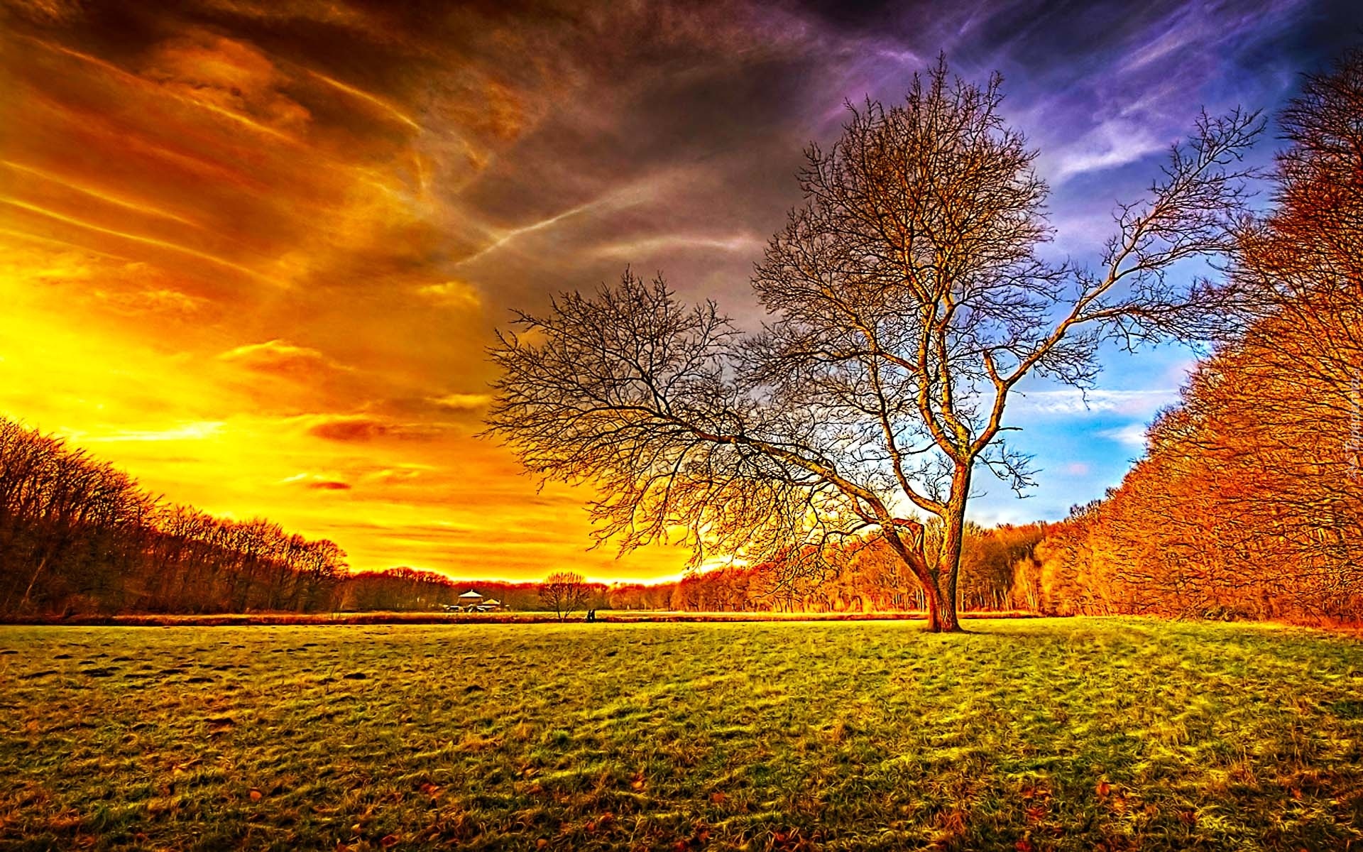 Edytor tapety: Zachod, Słonca, Las, Drzewo, Jesień
