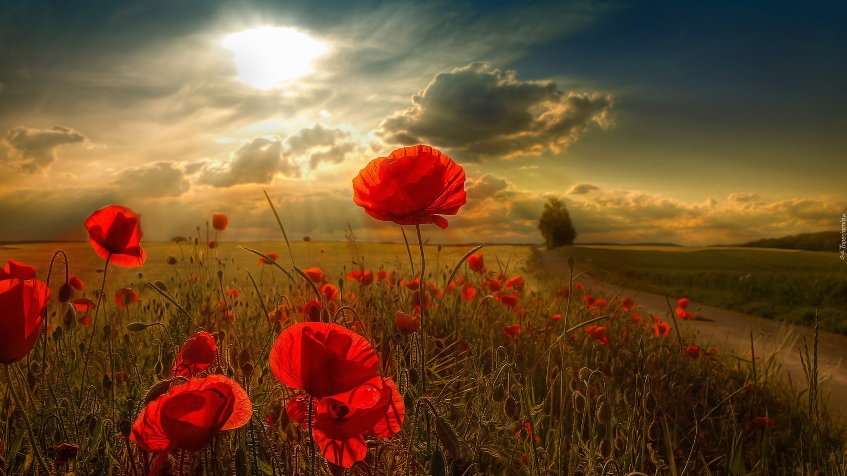 Edytor tapety: Chmury, Zachód, Słońca, Czerwone, Maki