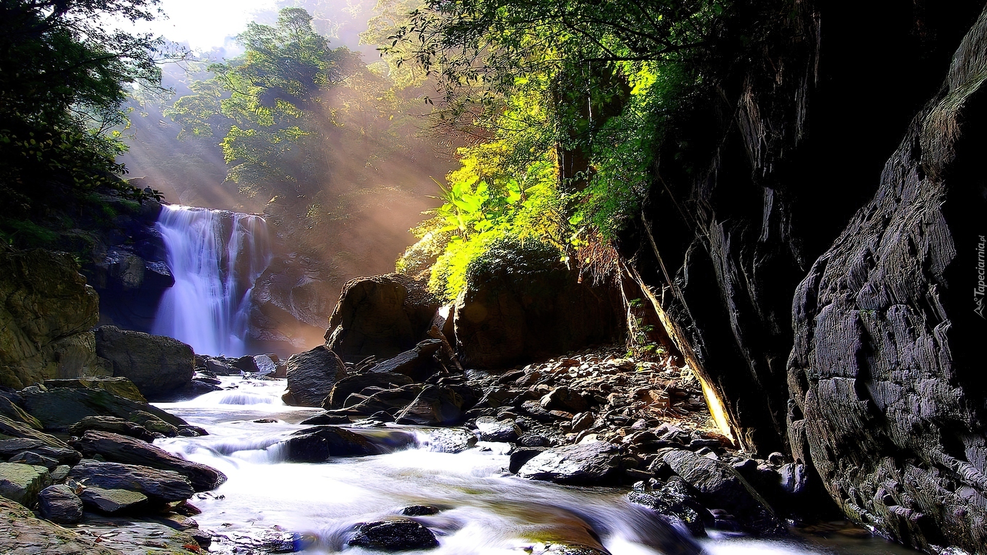 Edytor tapety: Wodospad, Woda, Kamienie, Drzewa