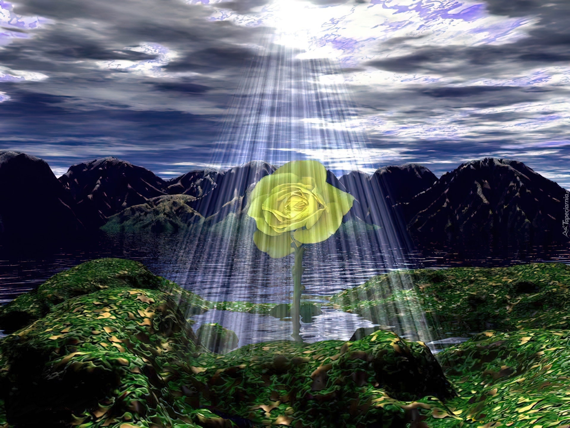 Edytor tapety: Róża, Promienie, Światła, Góry