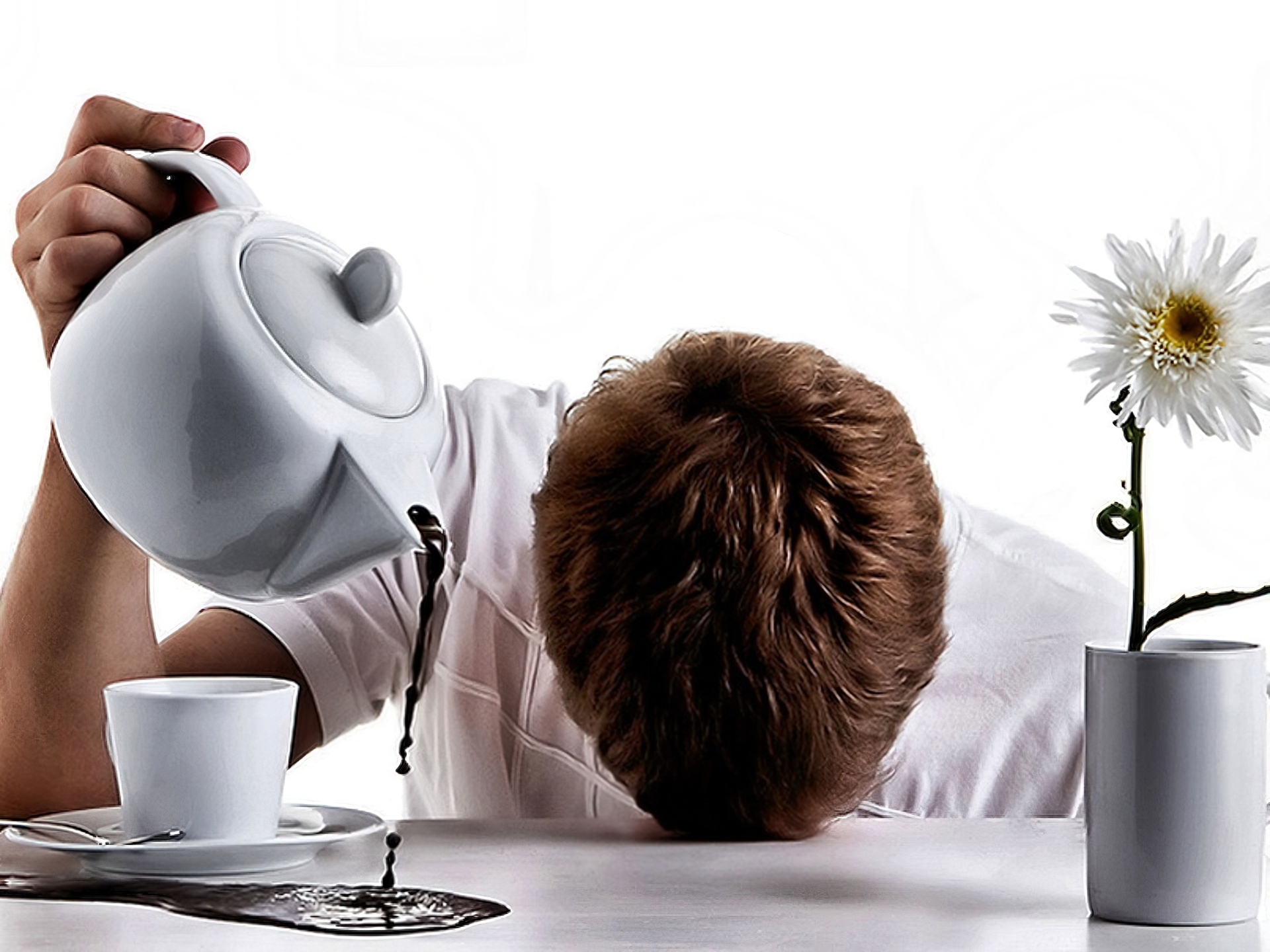 Edytor tapety: Śpiący, Mężczyzna, Kawa, Kwiatek