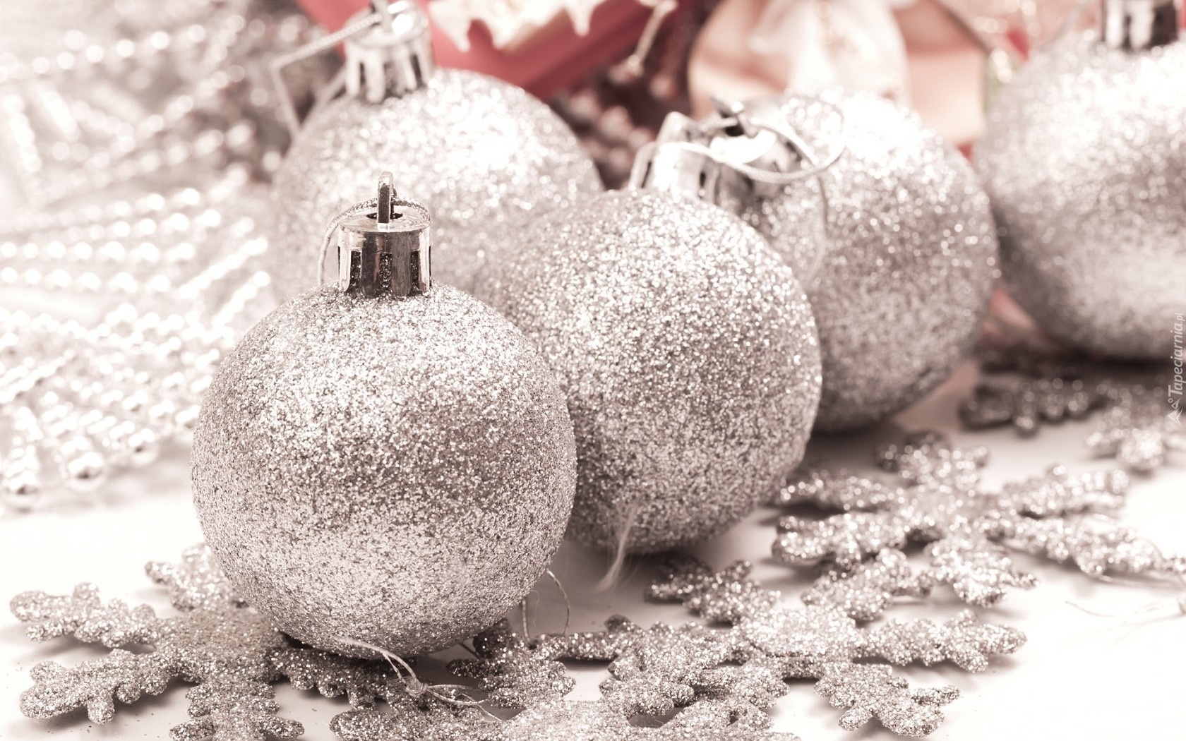 Edytor tapety: Srebrne, Bombki, Płatki, Śniegu
