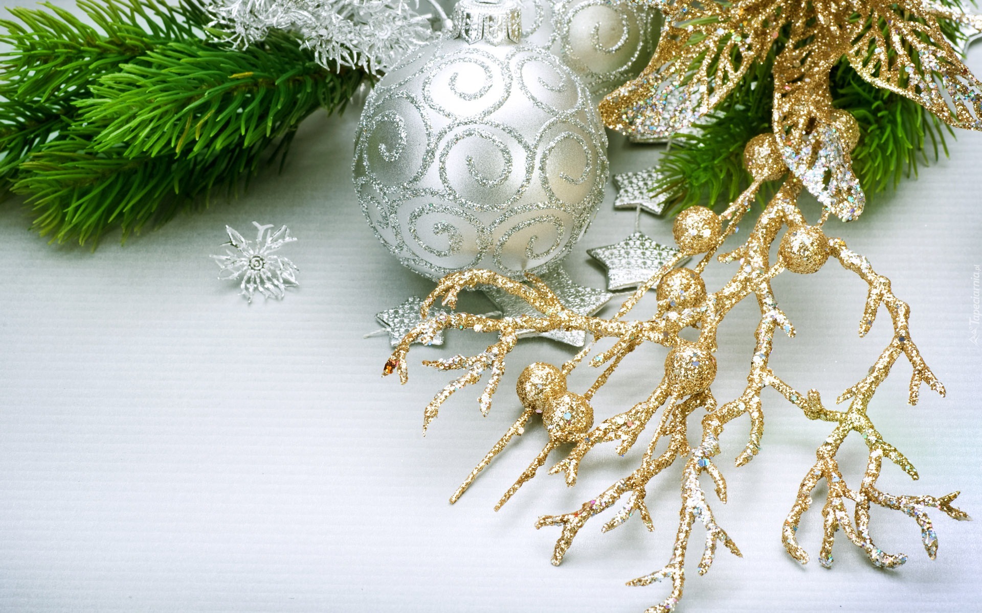 Edytor tapety: Srebrne, Bombki, Złota, Gałązka, Świerk