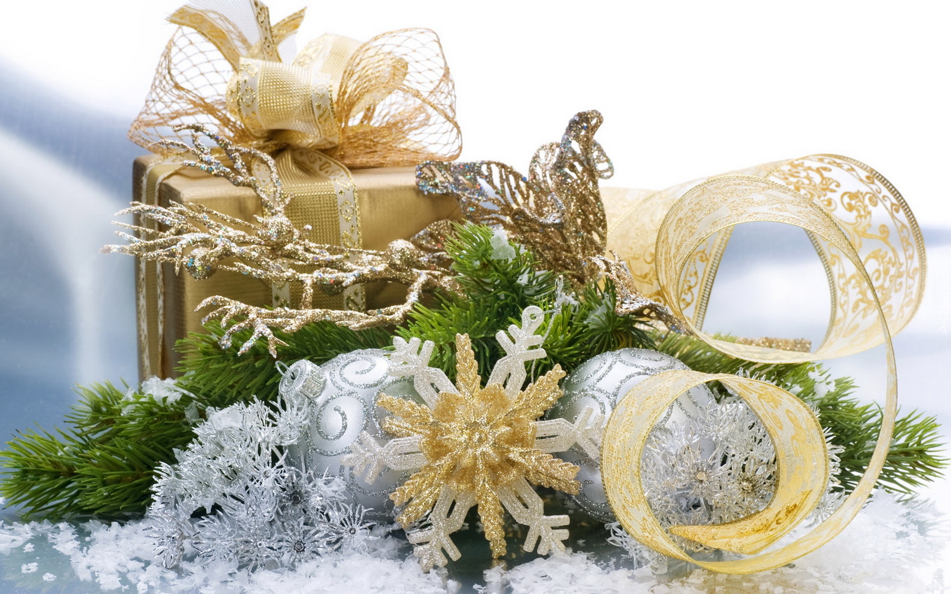 Edytor tapety: Prezent, Gałązka, Świerku, Wstążka, Bombki