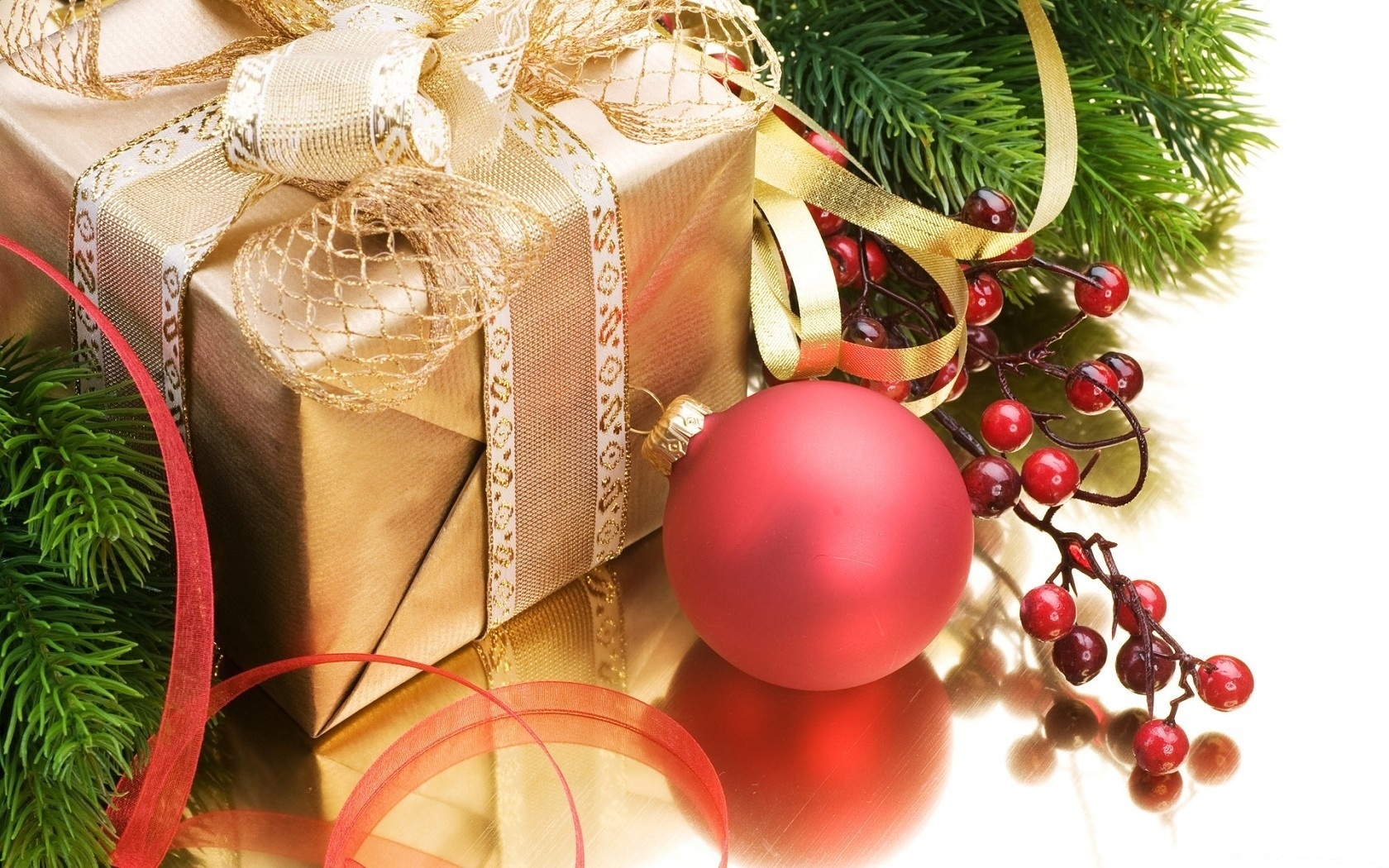 Edytor tapety: Prezent, Bombka, Świerk