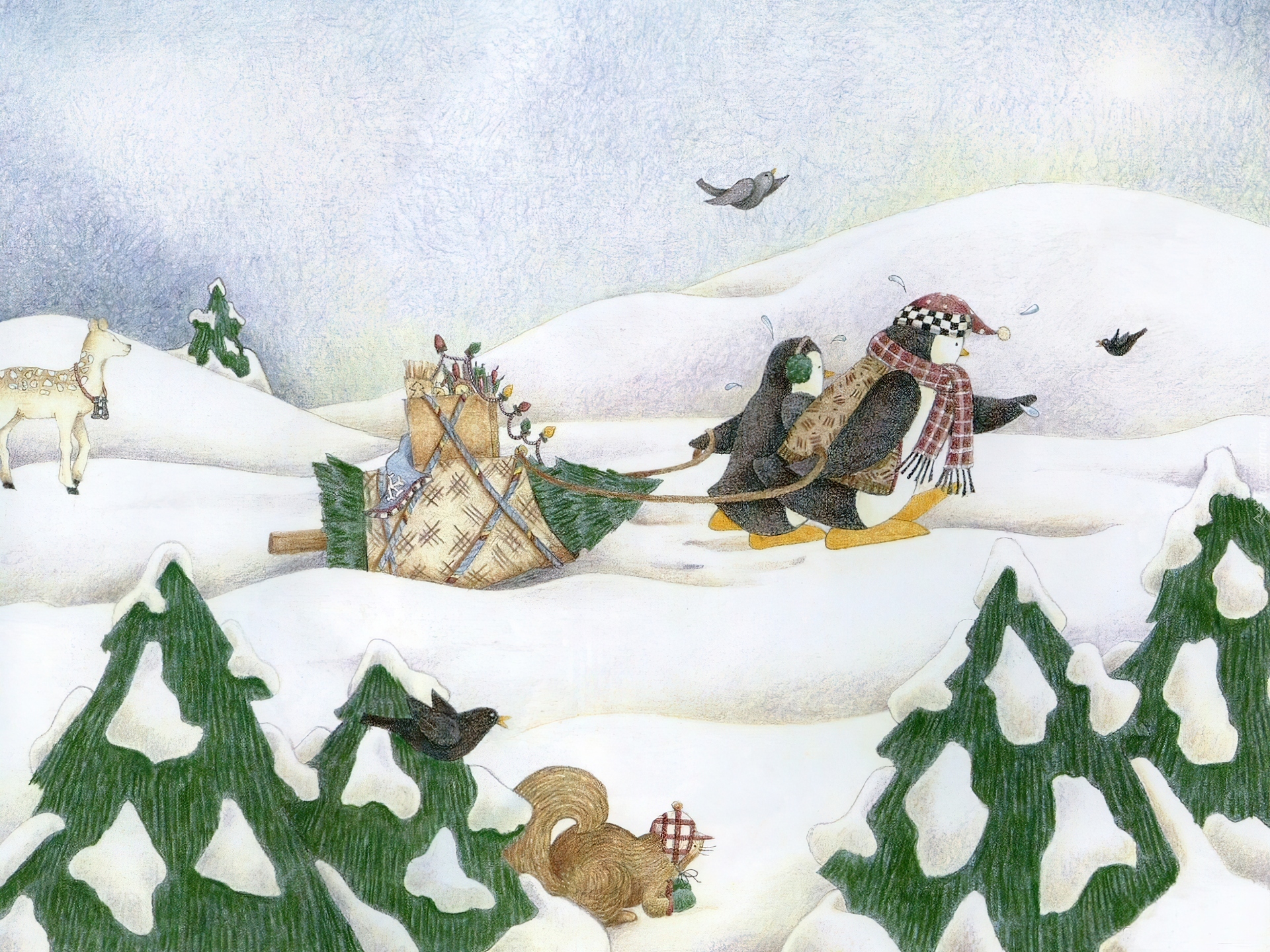 Edytor tapety: Zima, Śnieg, Pingwiny, Sanie, Choinka
