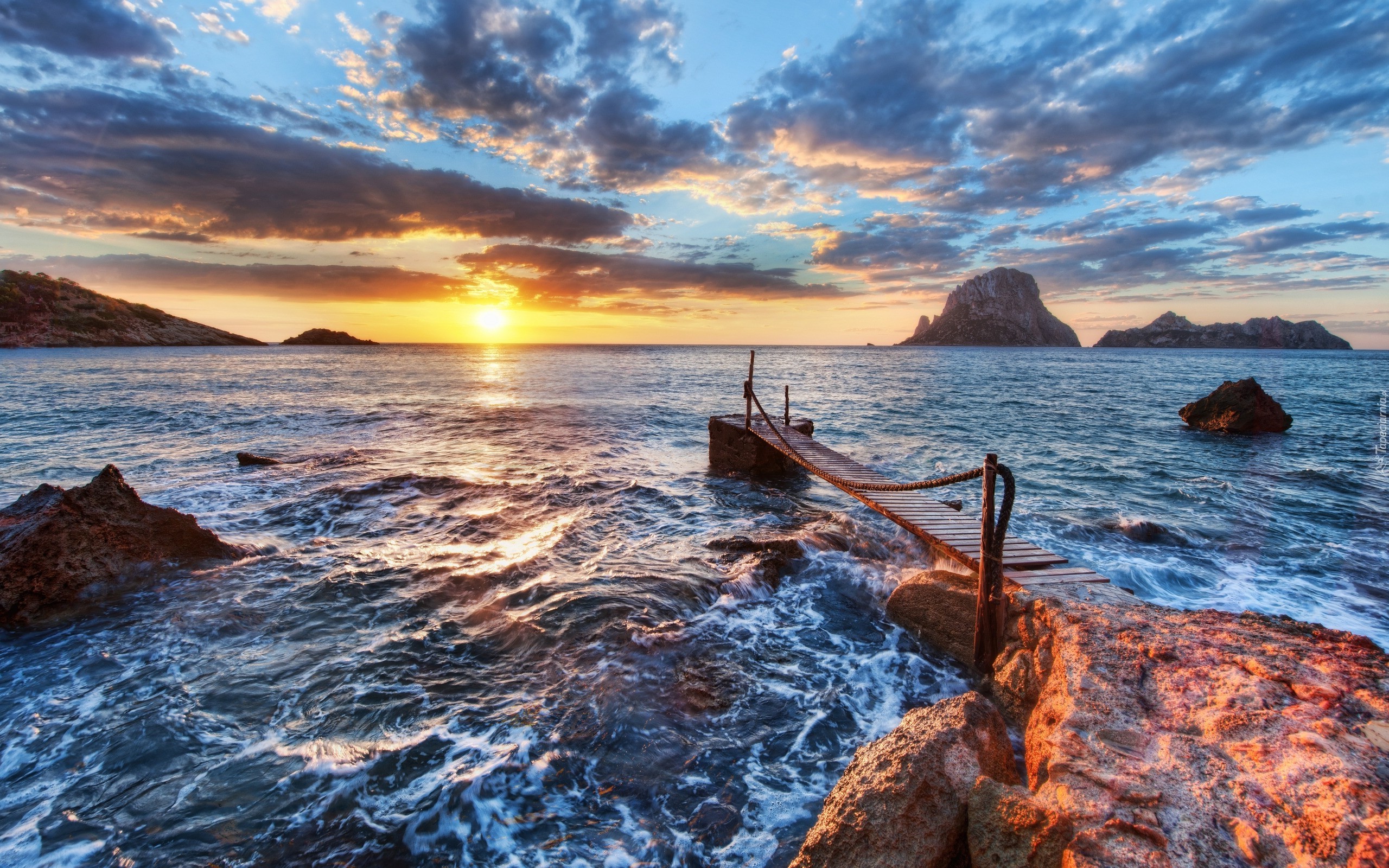Edytor tapety: Chmury, Zachód, Słonca, Morze, Skały, Molo