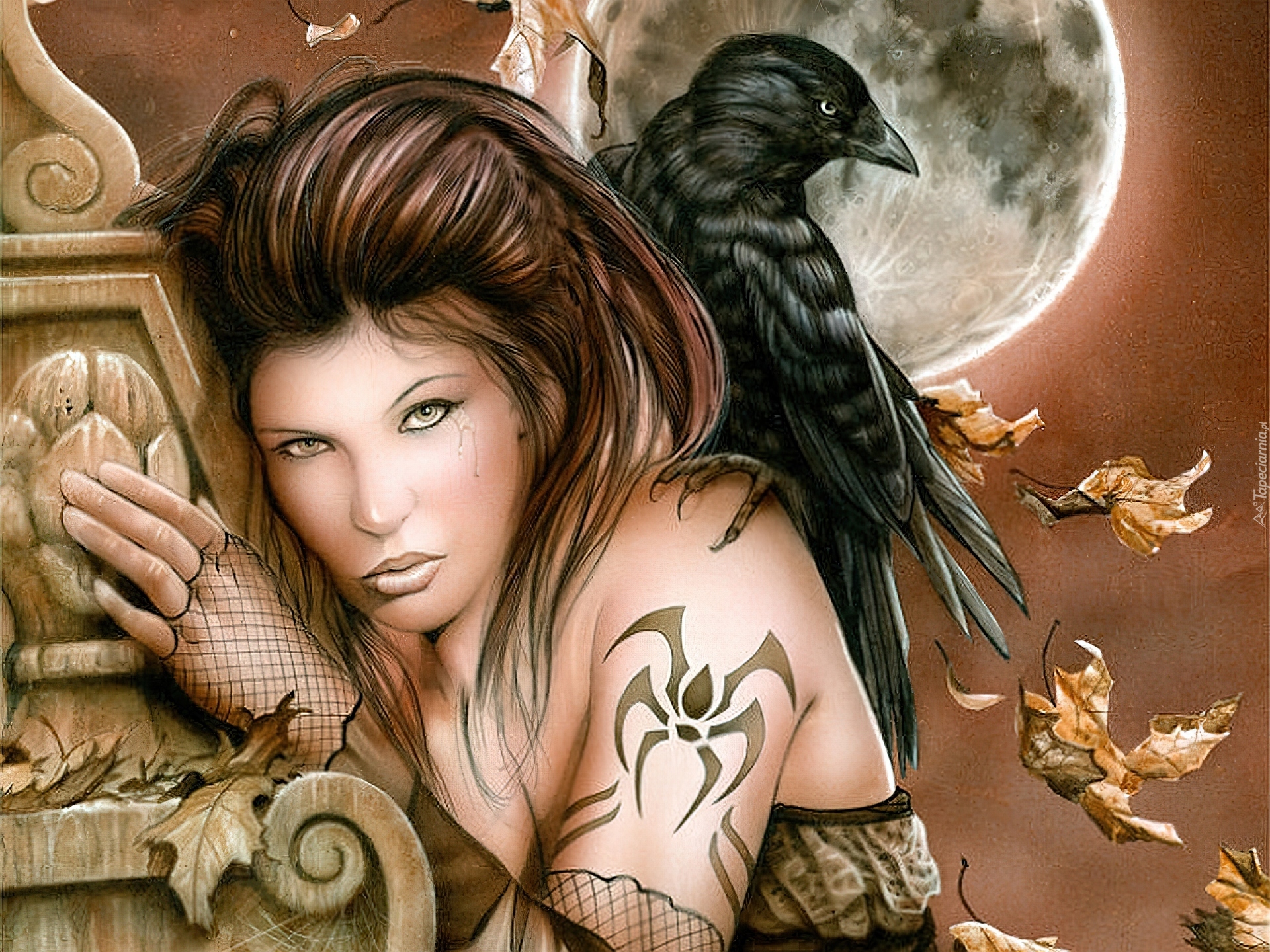 Edytor tapety: Dziewczyna, Łzy, Kruk, Liście