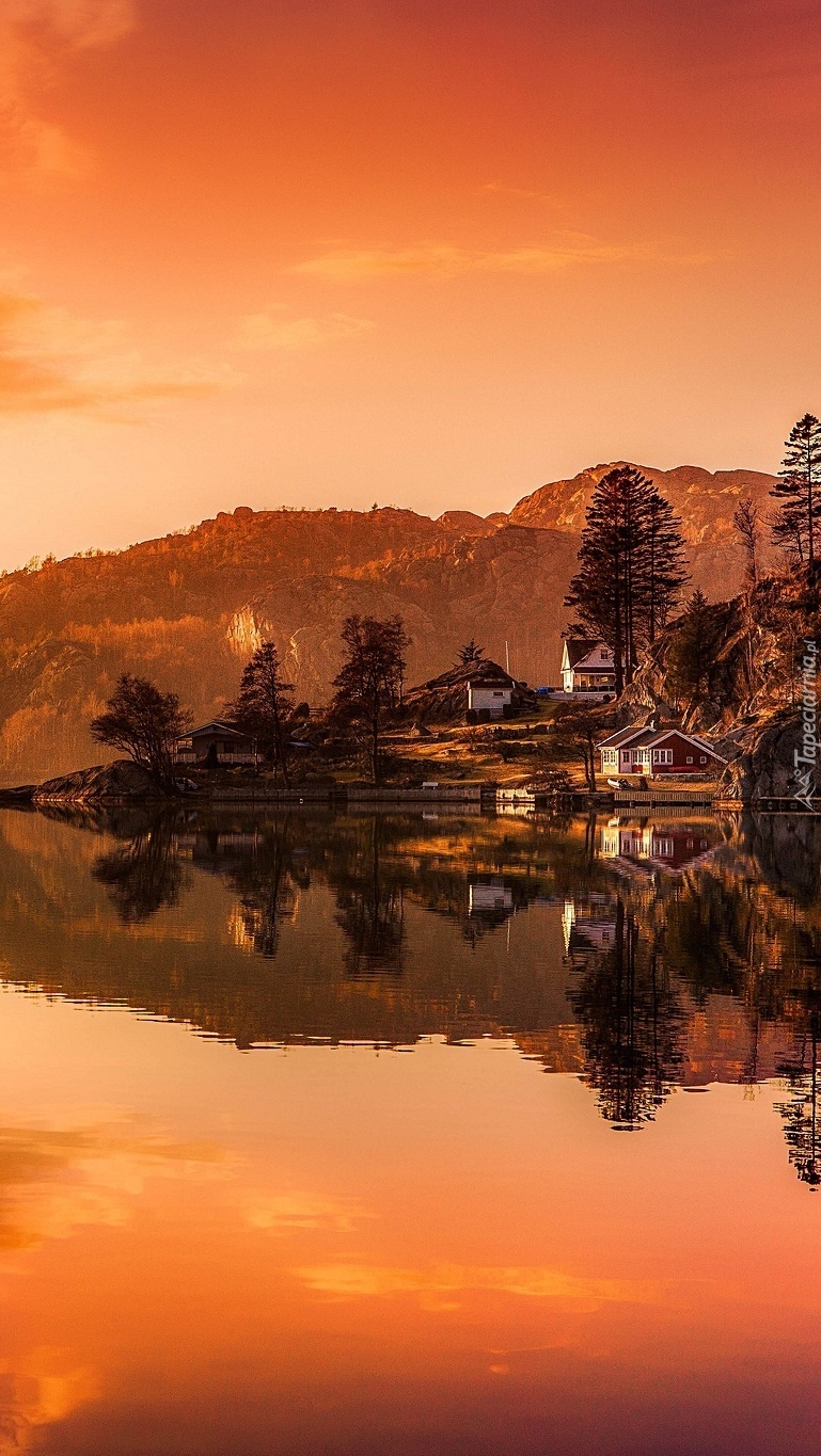 Edytor tapety: Zachód słońca nad domami i jeziorem